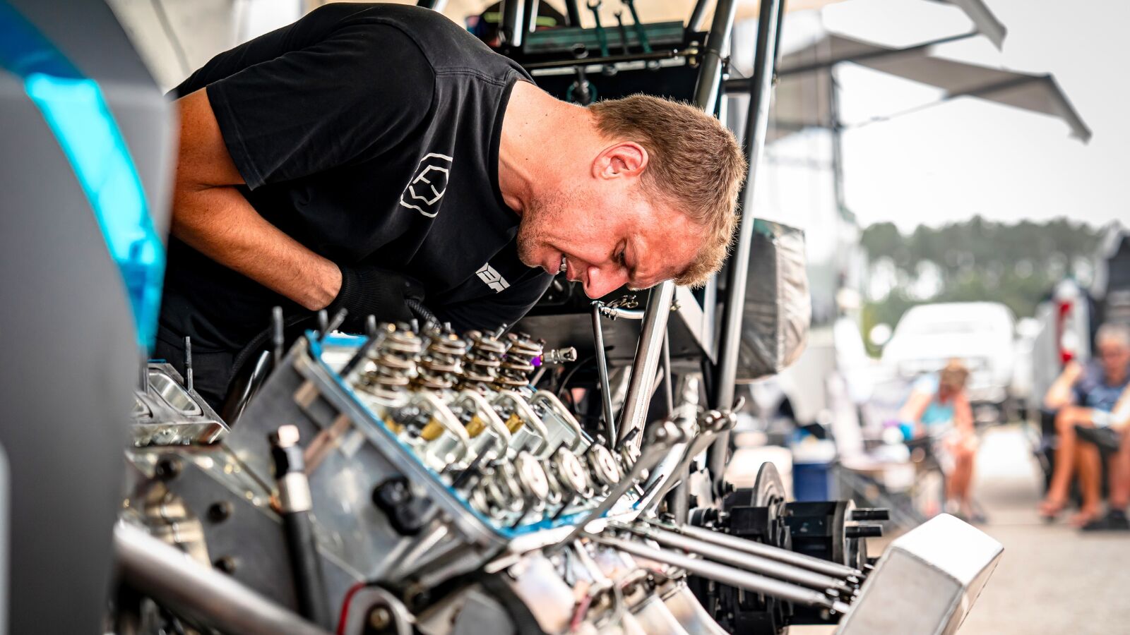 Corey Michalek, who grew up filming and working on Mark Thomas’ IHRA championship-winning Alcohol Funny Car, services the clutch on his Fund That Flip A/Fuel dragster that he drives and co-owns with brother Kyle. Photograph by Krista Zivcic
