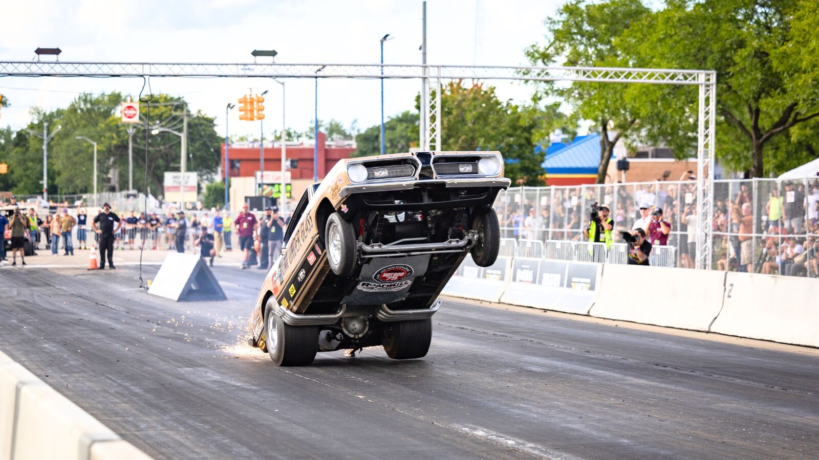 The iconic Hurst HEMI Under Glass ‘68 Barracuda wheelstander puts on a show for the fans at MotorTrend’s Roadkill Nights Powered by Dodge on Pontiac, Michigan’s Woodward Avenue. Photograph by Kevin DiOssi