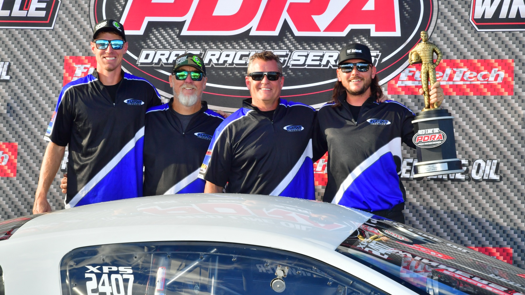 Newly crowned two-time PDRA Extreme Pro Stock world champion Alan Drinkwater added one more event win to his 2025 scorecard when he defeated rising star Jordan Ensslin in the final round of the Brian Olson Memorial World Finals at Virginia Motorsports Park. To secure his fourth win of the season, Drinkwater left the starting line first in his Kaase-powered Flatout Gaskets ’08 Mustang and turned on the win light with a 4.077 at 177.98. Ensslin, who won the Summit PDRA ProStars race on Thursday, posted a close 4.079 at 176.72 in the runner-up effort.