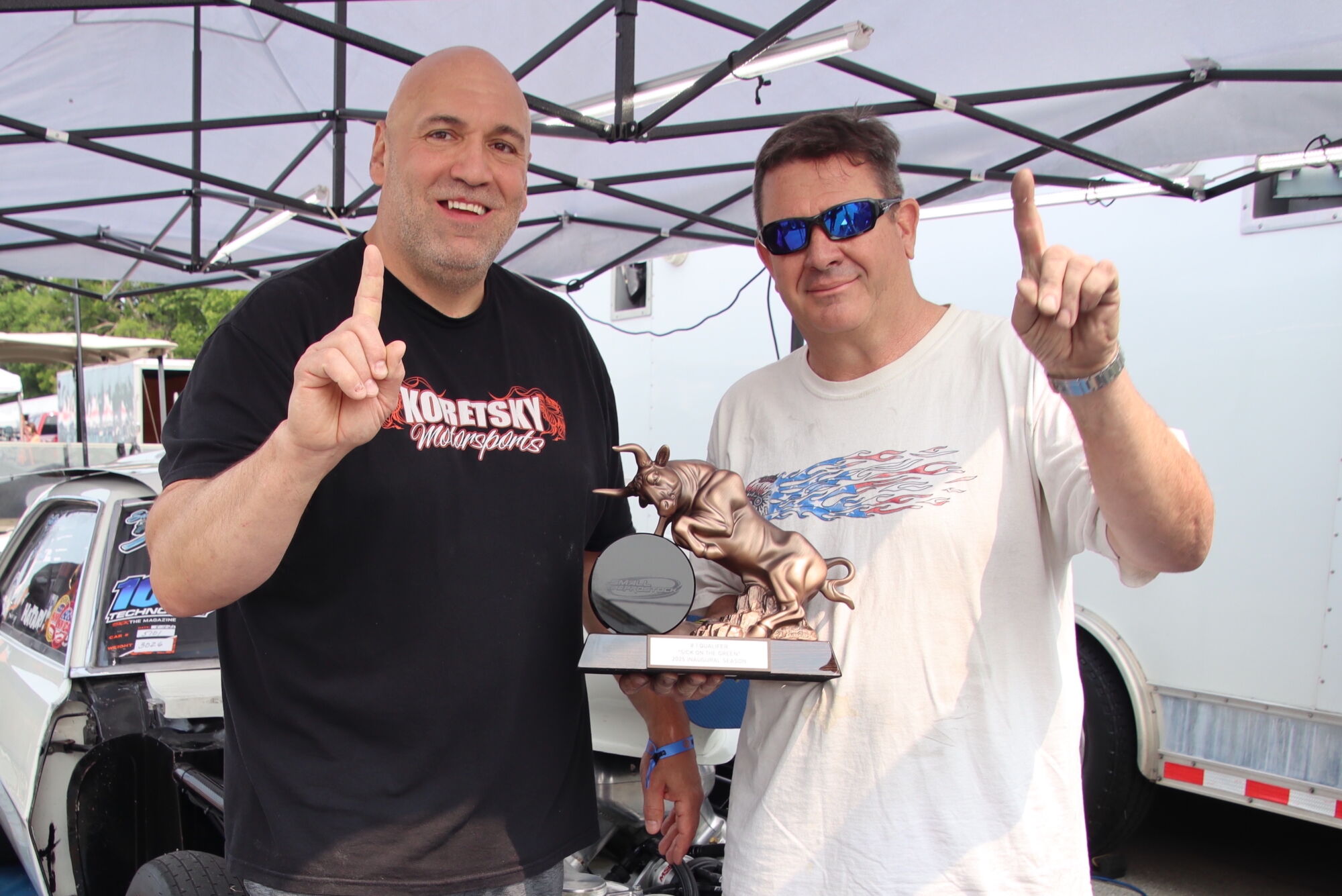 Langer, who led qualifying with a 7.67 trip in his Trans Am, earned the beautiful bull-themed trophy and a $250 top-qualifier bonus sponsored by Dolce and Clemente’s Market and V & J Inc. On race day, he won the first round of eliminations with a 7.74 over Jeff Ikard, who trapped an 8.12 in his Mustang, and had a bye-run in the second round of eliminations. That set the stage for his final round appearance and runner-up against Ausmus.