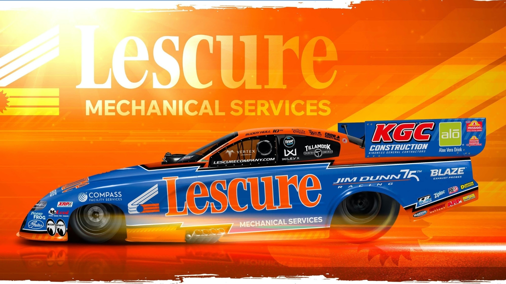 NHRA Funny Car driver Buddy Hull, representing Jim Dunn Racing, is heading into the Muckleshoot Casino Resort NHRA Northwest Nationals at Pacific Raceways, July 18-20, with renewed energy and a fresh look. The Dallas-based driver will debut a Lescure Mechanical Services livery on his 12,000-horsepower Funny Car, marking the first time this season the team will feature the California-based mechanical contractor as the primary sponsor on the car’s paint scheme.
