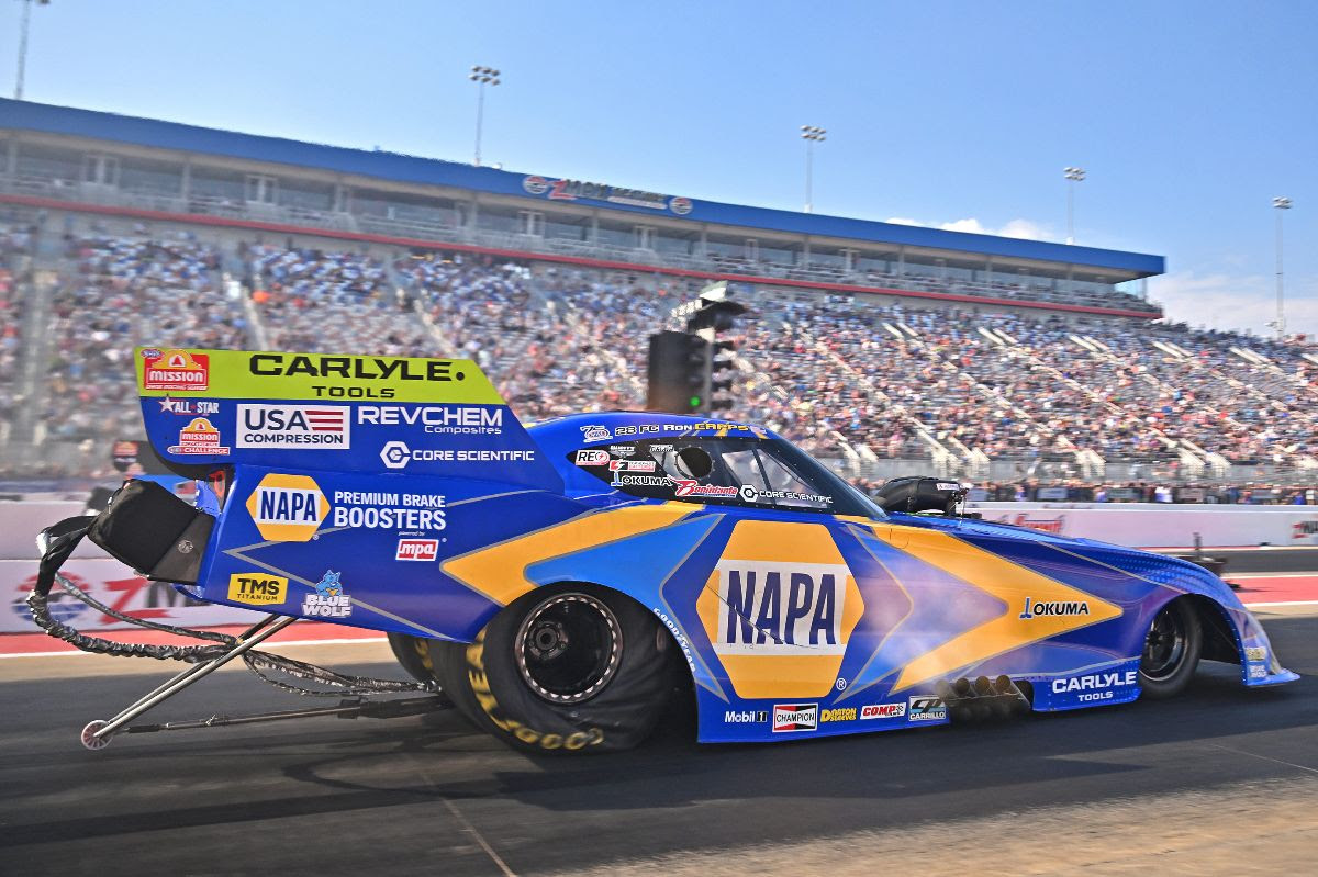Three-time NHRA Funny Car world champion Ron Capps kept the momentum from the strong start to his 2026 campaign rolling at the NHRA 4-Wide Nationals, taking his NAPA Auto Care Funny Car to the provisional No. 1 spot Friday night under the lights at zMAX Dragway. Capps clocked a session-best 3.883 E.T. at 333.91 mph during Q2 to land at the top of the timing sheets heading into Saturday qualifying.