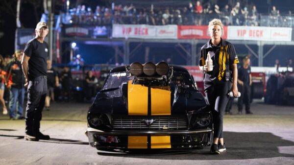 Anita Cunningham waits for the signal to squirt some fuel into the injector hat on the screw-blown Stroud Safety “Rent-A-Racer” ‘67 Mustang driven by...