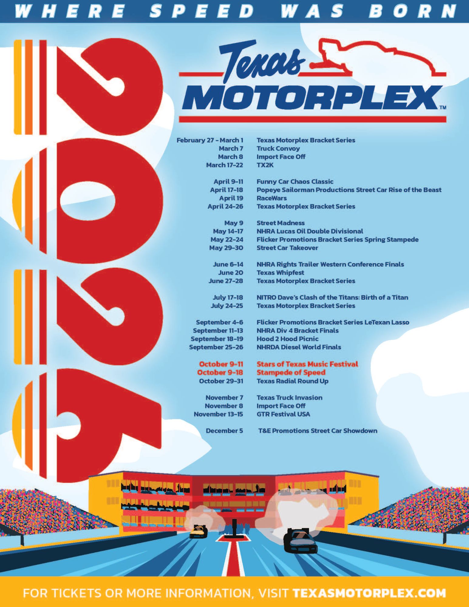Heading into 2026 after one of the most successful seasons in Texas Motorplex history, the world famous all-concrete race track and multi-use facility will be looking to expand its family friendly events and races this season. With a long history of hosting some of the biggest drag racing events in the country and on the heels of one of the largest music festivals in the state of Texas last year, the 6th annual Stampede of Speed, October 9-14, will once again feature the fastest motorsports in the world during the 41st Texas Fall Nationals, October 14-18 and the biggest names in country music October 9-11 during the Stars of Texas Music Festival. The track will also host a wide variety of national and regional events including the NHRA Right Trailers Junior Dragster Western Conference Finals.