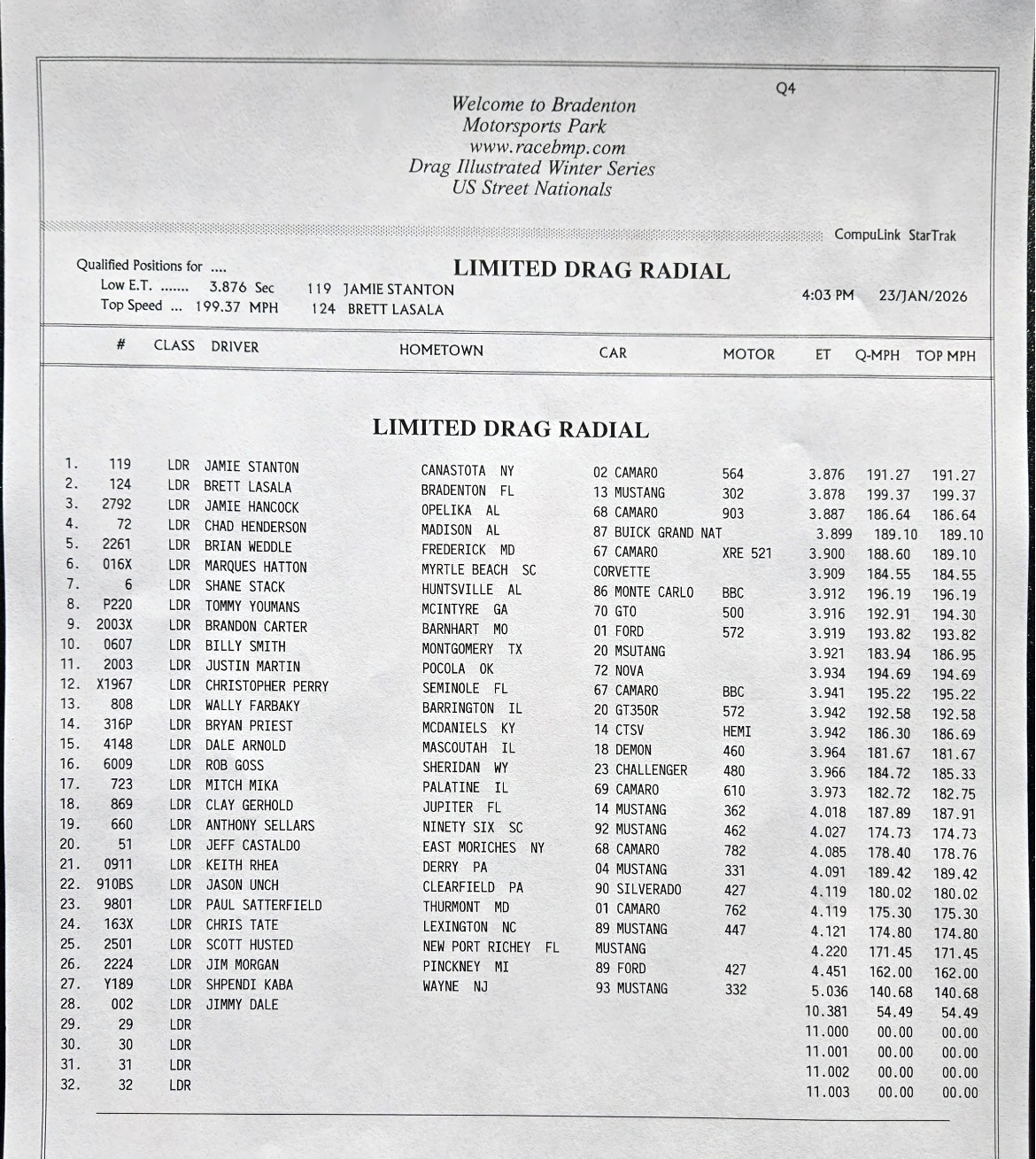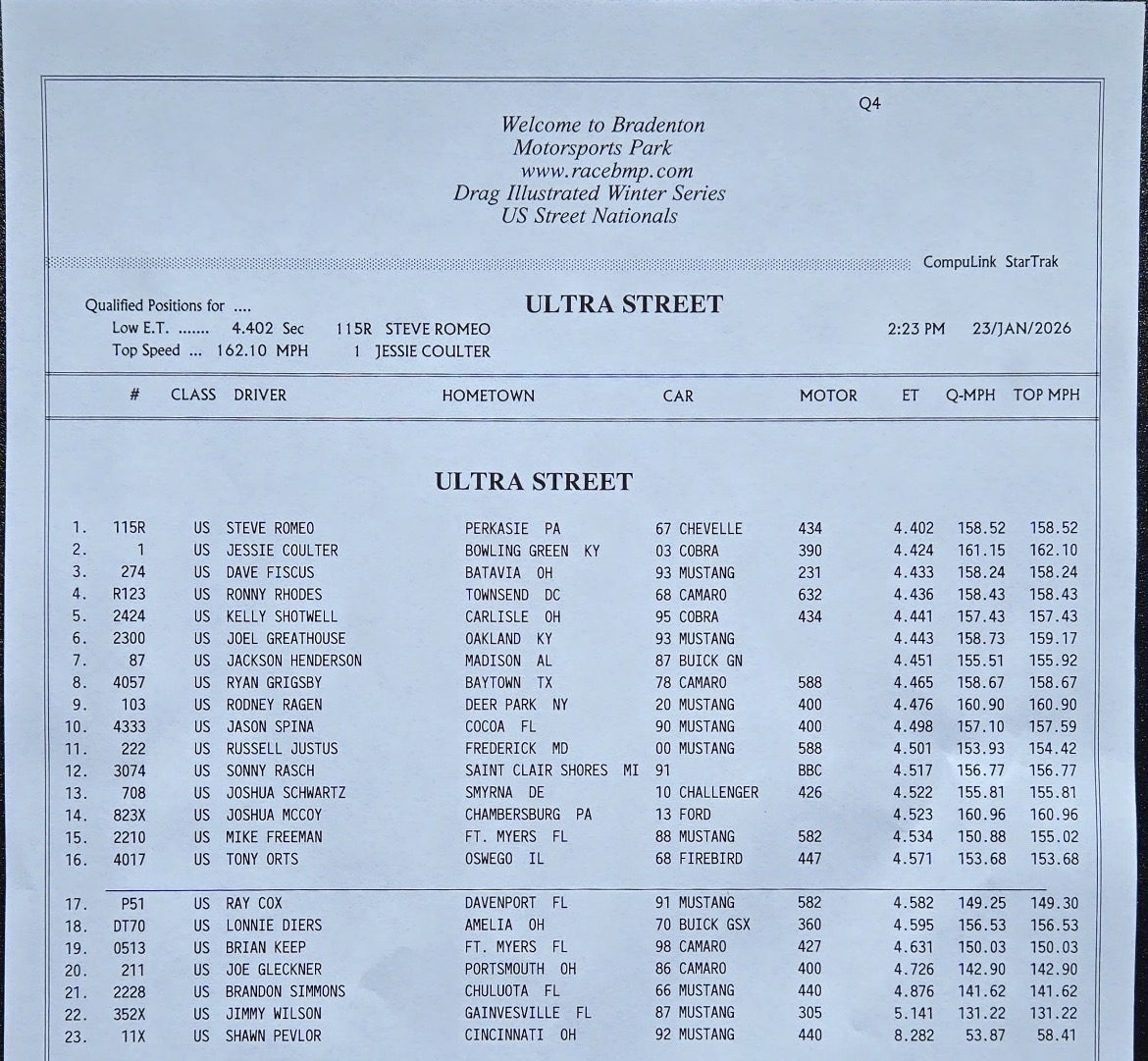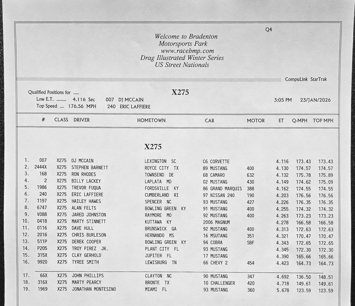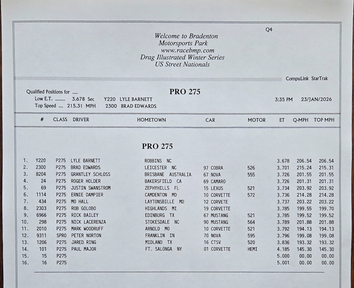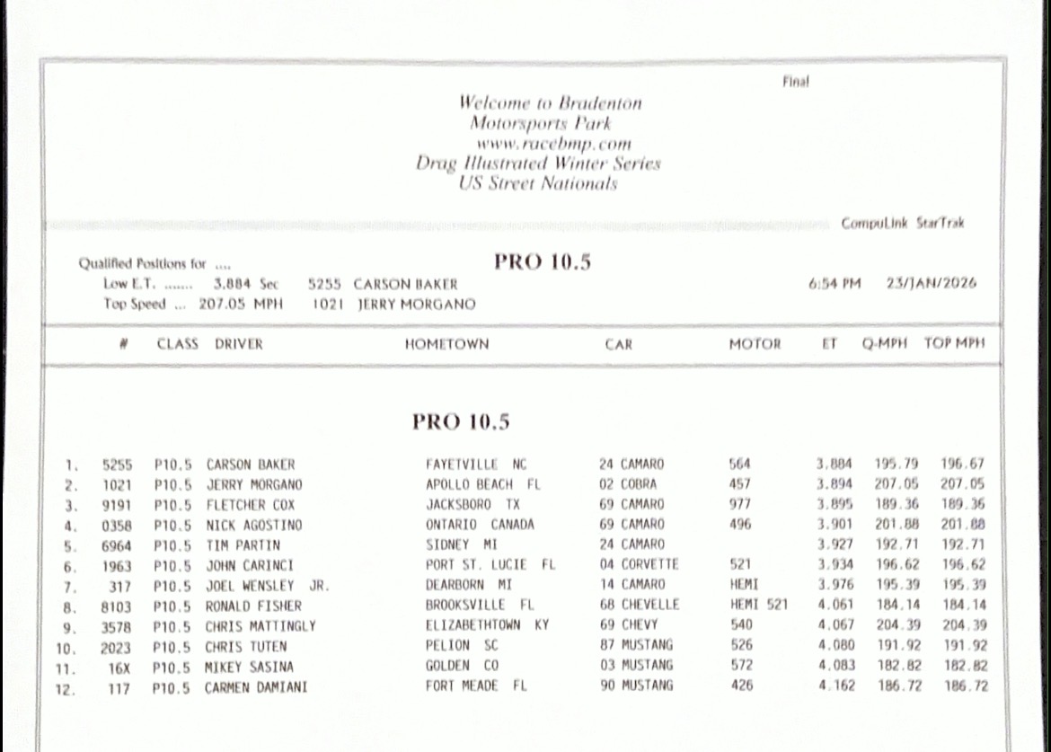 The 2026 U.S. Street Nationals presented by M&M Transmission at Bradenton Motorsports Park continues Friday with more qualifying. It’s the second of three races in the 2025/2026 Drag Illustrated Winter Series presented by J&A Service, along with the season opener for the FuelTech Radial Outlaws Racing Series.
