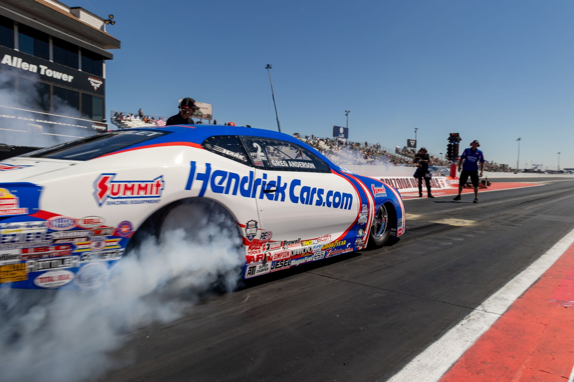 The second race of NHRA’s 75th anniversary season is off to a blazing start at Firebird Motorsports Park in Chandler, Ariz., and Greg Anderson and his HendrickCars.com Chevrolet Camaro have risen to the top on a blistering first day of the 41st annual FMP NHRA Arizona Nationals presented by NGK Spark Plugs. After the first two rounds of qualifying, Anderson was sitting in the No. 1 spot, and with more hot weather to be dished out on Saturday, odds are reasonably good that he will be able to protect the position and earn the 141st pole of his career.