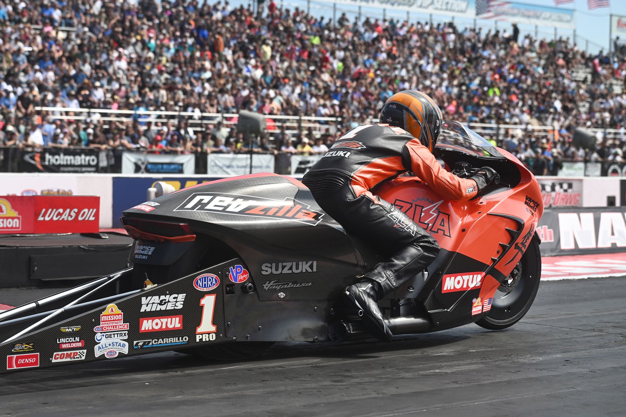 Pro Stock Motorcycle’s Gaige Herrera wasn’t challenged for the No. 1 spot on Saturday, as the points leader picked up his fifth No. 1 qualifier this season thanks to Friday’s 6.745 at 200.20 on his RevZilla/Motul/Vance & Hines Suzuki.
