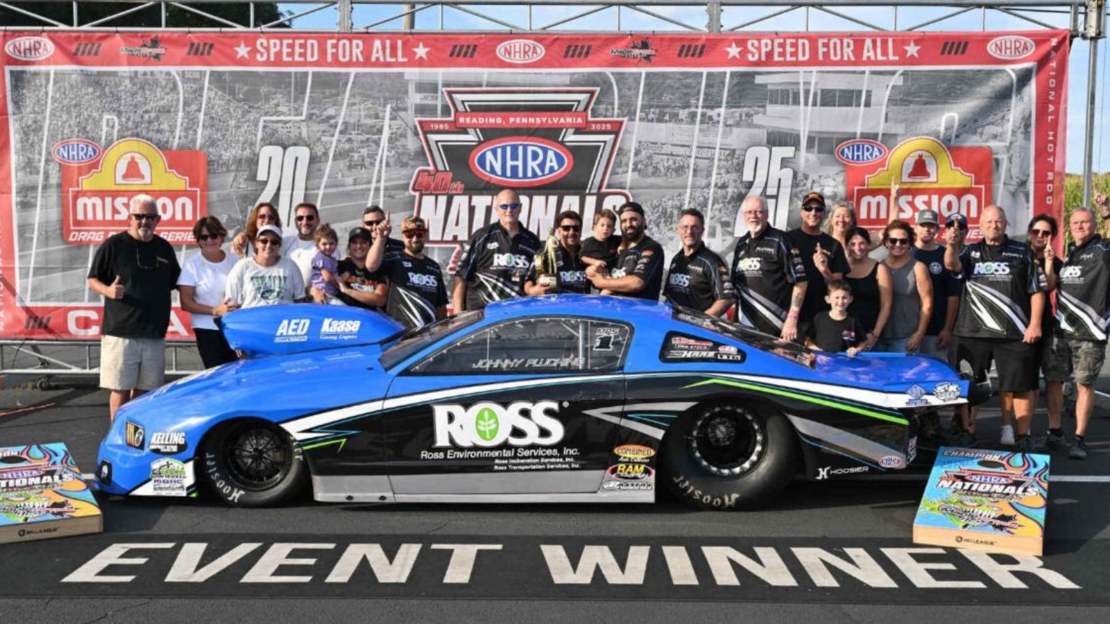 Reigning world champion Johnny Pluchino and his Ross Environmental Services Ford team earned their first Johnson’s Horsepowered Garage Mountain Motor Pro Stock victory of the season Sunday at the 40th annual NHRA Reading Nationals at Maple Grove Raceway.
