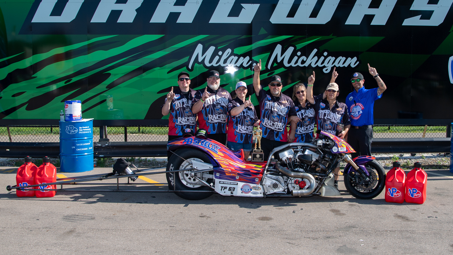 Closing out the day, Jay Turner, a Hall of Fame motorcycle racer, collected his 18th IHRA national-event win in Top Fuel Harley, running 6.365 at 134.81 mph to defeat Jordan Peterson, who had a slight starting line edge but ran a slower 6.533 in a tire-smoking final.