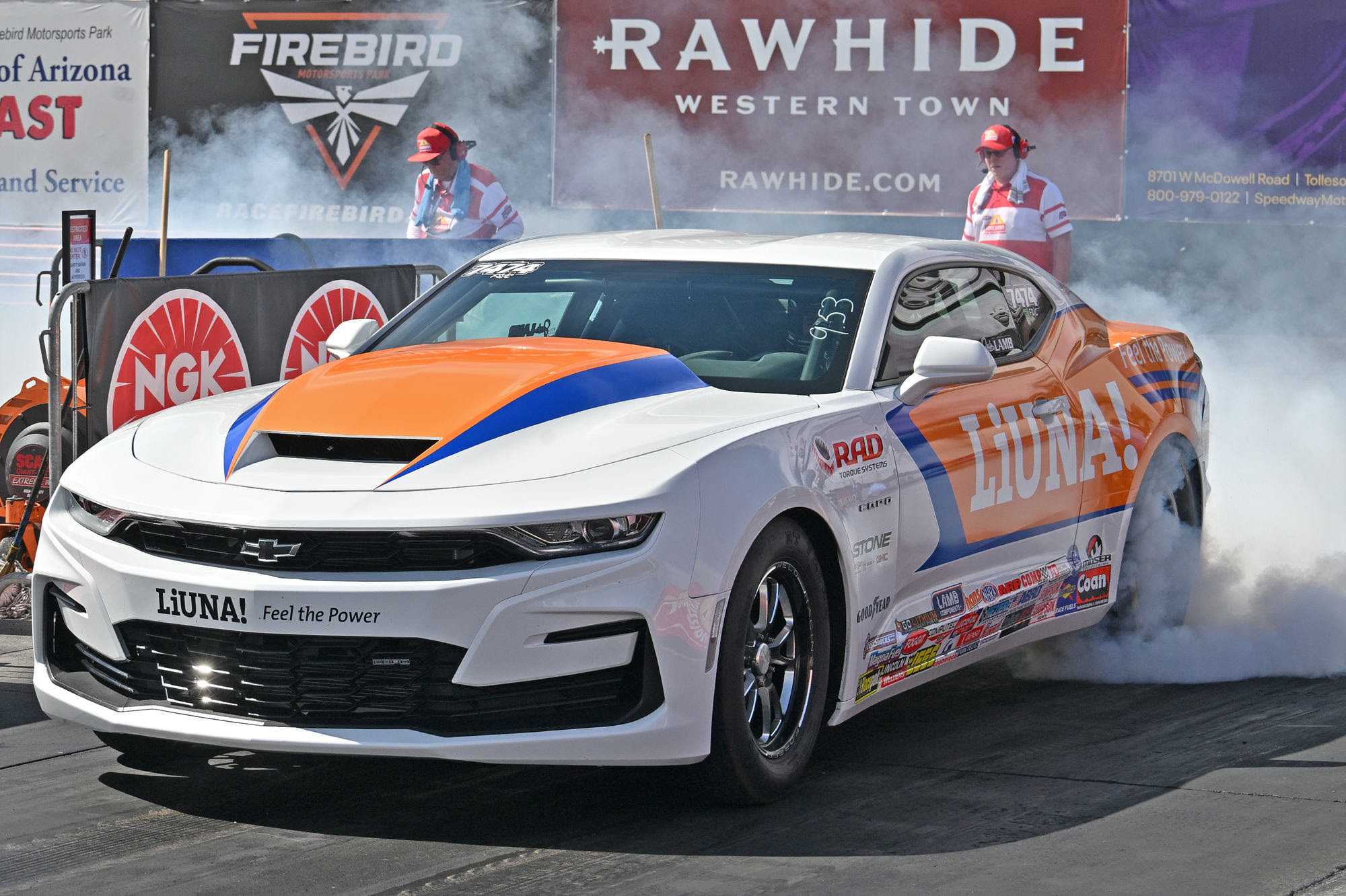 A 144-degree Fahrenheit racing surface was anything but welcoming, but Lamb and the LIUNA Chevy maneuvered the track a bit better to claim a ticket to Sunday eliminations. Victory was coming into view, but first, he had to get past good friend and five-time world champion Jimmy DeFrank in the semifinals. Both drivers were eager to race their worthy opponent, but DeFrank left the starting line -.012 too soon and set the red light glowing, allowing Lamb to move ahead to the 53rd final of his career. Successfully defending the Stock title he earned there at last season’s national event, Lamb’s win light over veteran competitor Leo Glasbrenner translated to a sixth national event win at Firebird Motorsports Park.