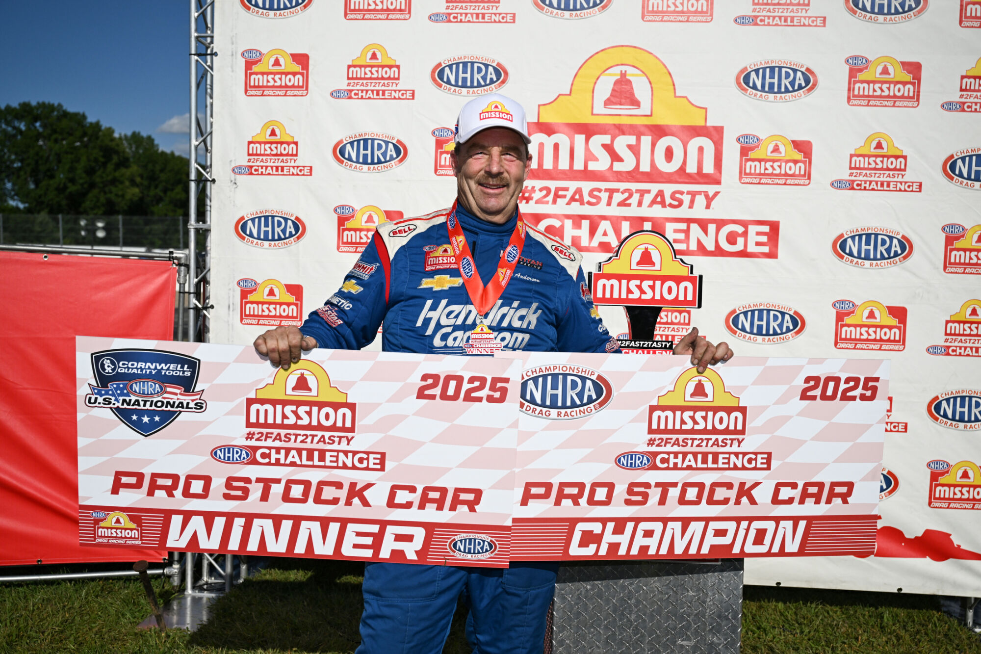 Pro Stock’s Greg Anderson enjoyed a stellar Saturday, winning his second straight Mission #2Fast2Tasty Challenge and taking the overall specialty race championship in the process, defeating Erica Enders in the final round with a run of 6.523 at 210.14 in his HendrickCars.com Chevrolet Camaro.