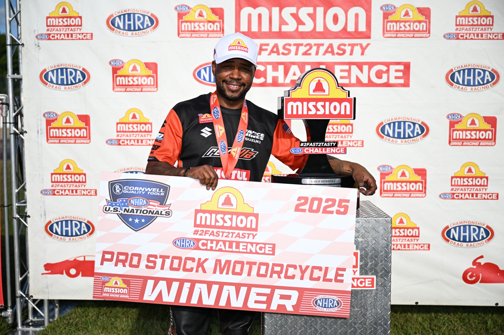 Richard Gadson got the best of Matt Smith in the final round of the Mission #2Fast2Tasty Challenge in Pro Stock Motorcycle, going an impressive 6.744 at 201.01 on his RevZilla/Motul/Vance & Hines Suzuki.