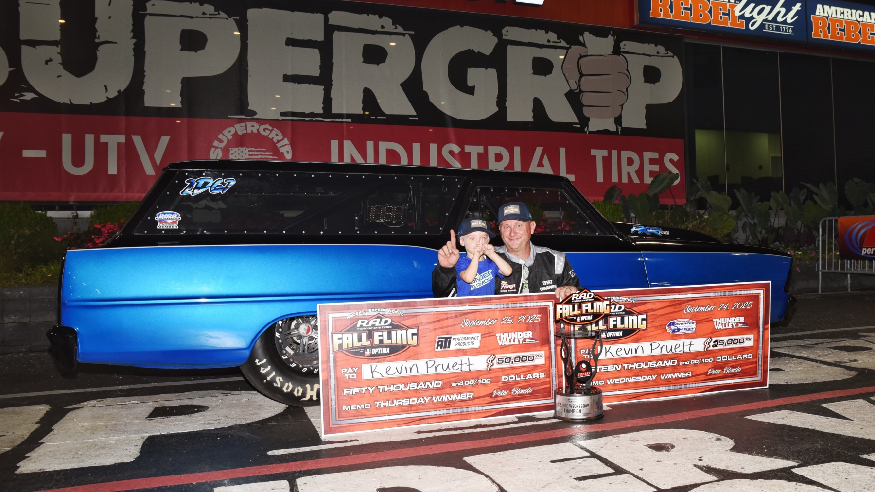 The Chevy II Wagon of Kevin Pruett from Appling, GA put together .018 total in the final over the dragster of Matt Schapiro from Tabernacle, NJ. Pruett’s .012 and dead-on six lap carried him to his first-ever Fling event win, putting him at the top of the leaderboard for the Robco Residential Fall Fling Points Championship going into the next $75K main event.