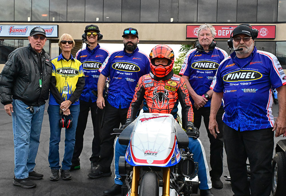McBride had a long list of sponsors and team to credit. “I would like to thank Pingel Enterprise, Drag Specialties, Vance & Hines Motorsports, Bill Miller Engineering, Trim-Tex, Web Cam, Worldwide Bearings, A.P.E., Final Swipe, Mickey Thompson Tires, Red Line Oil, Torrence Racing, Simpson Race Products, Goodridge Hose and Fitting, Belt Drives Ltd., B&J Transmission, Beringer Brakes, Boninfante Friction, Brocks Performance, BST Wheels, Cometic Gaskets, D.M.E., Ferrea Valves, Kibbelewhite, LA Sleeve, MPS, PR Factory Store, Valco, Dave Dunigan and Jimmy Brantley.