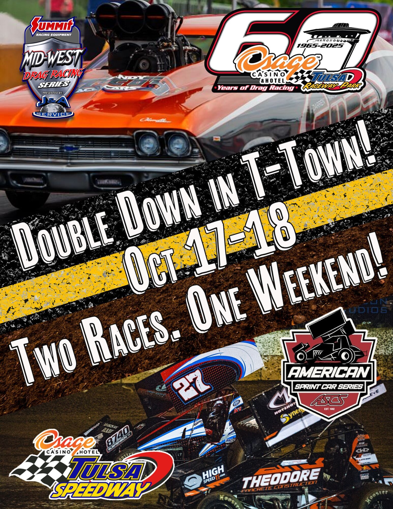 The Mid-West Drag Racing Series, in partnership with Osage Casino & Hotel Tulsa Raceway Park and Tulsa Speedway, is proud to announce a first-of-its-kind motorsports experience: DOUBLE DOWN IN T-TOWN – a two-day, two-track extravaganza featuring drag racing’s Throwdown in T-Town / Ronnie Hobbs World Finals and dirt racing’s Dirt Down in T-Town, all for one unbeatable price.