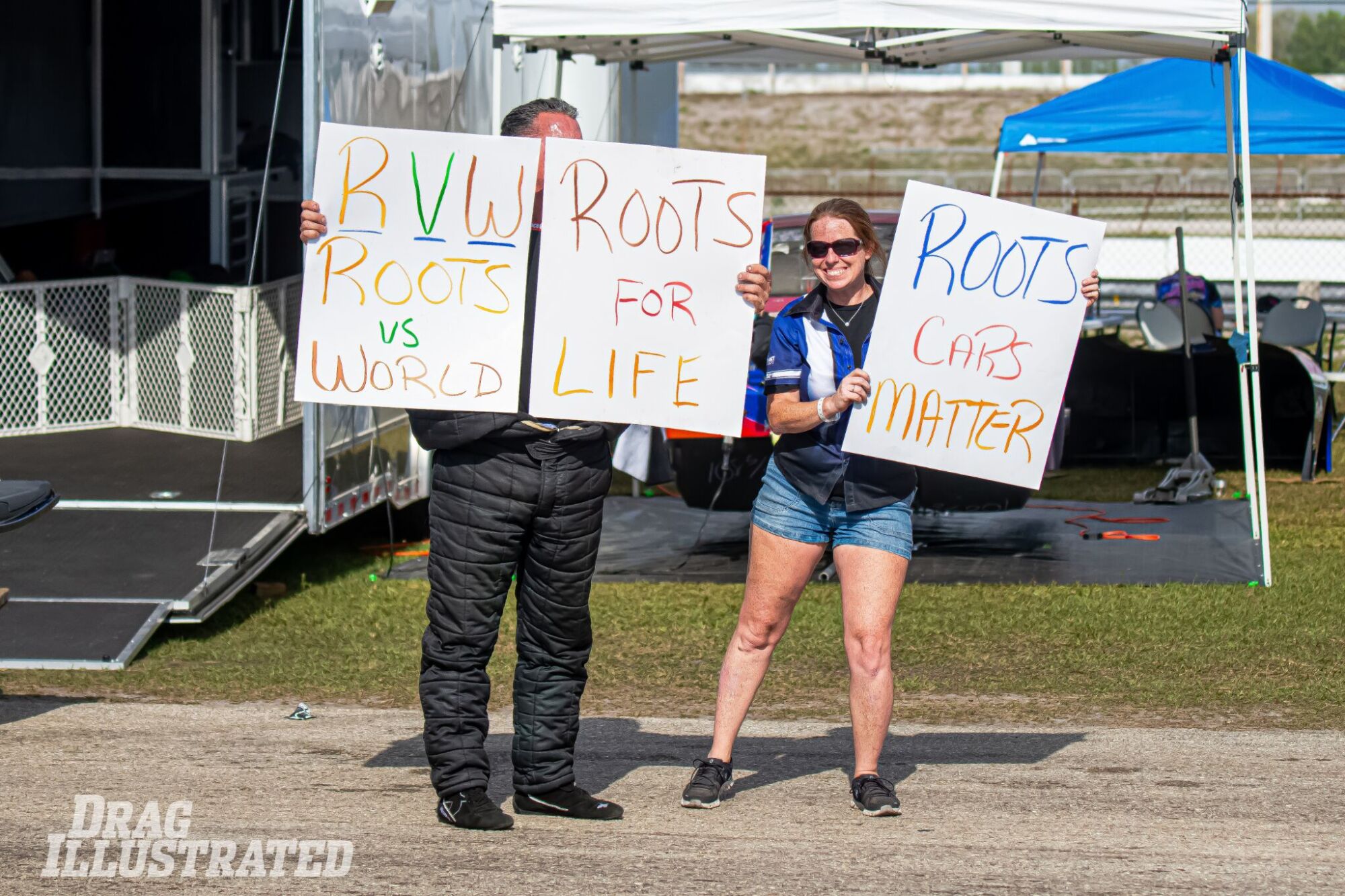 ROOTING FOR THE ROOTS: Hidden behind his signs, Pro Mod driver Bob Glenn and his daughter, Ashley Graziano, make their voices heard for the roots supercharger combination. Glenn was the only driver utilizing the combo in this year’s WSOPM Pro Mod field.