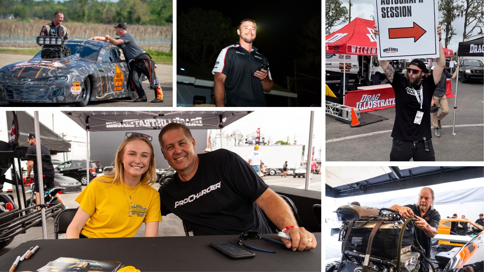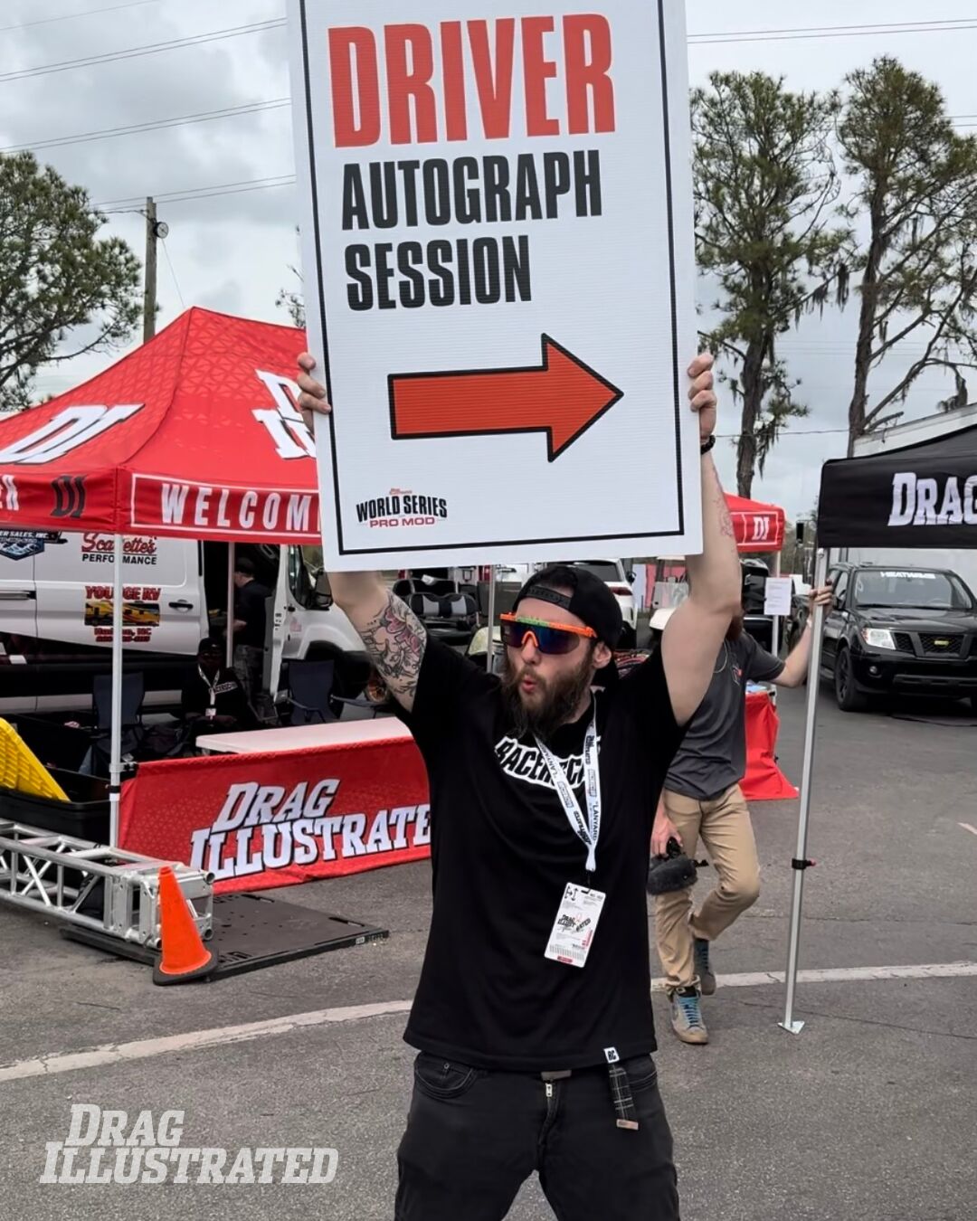 TEAM PLAYER: RACERSCLUB Brand Manager Josh Dixon jumps into action to make sure fans entering Bradenton Motorsports Park know about the autograph session happening at the DI booth in the staging lanes. In addition to the open pits, fans had numerous opportunities to meet their favorite drivers.