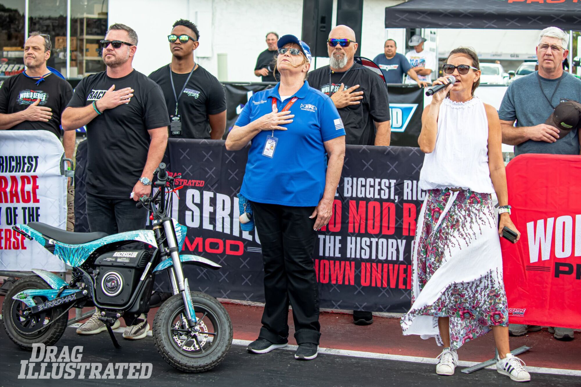 AMERICAN PRIDE: DI Founder and Editorial Wes Buck (left), Racers For Christ Chaplain Tammie Smith (middle), and a row of fans stand at attention facing the flag as Sylvie Valiente performs the national anthem on Sunday afternoon at the WSOPM.