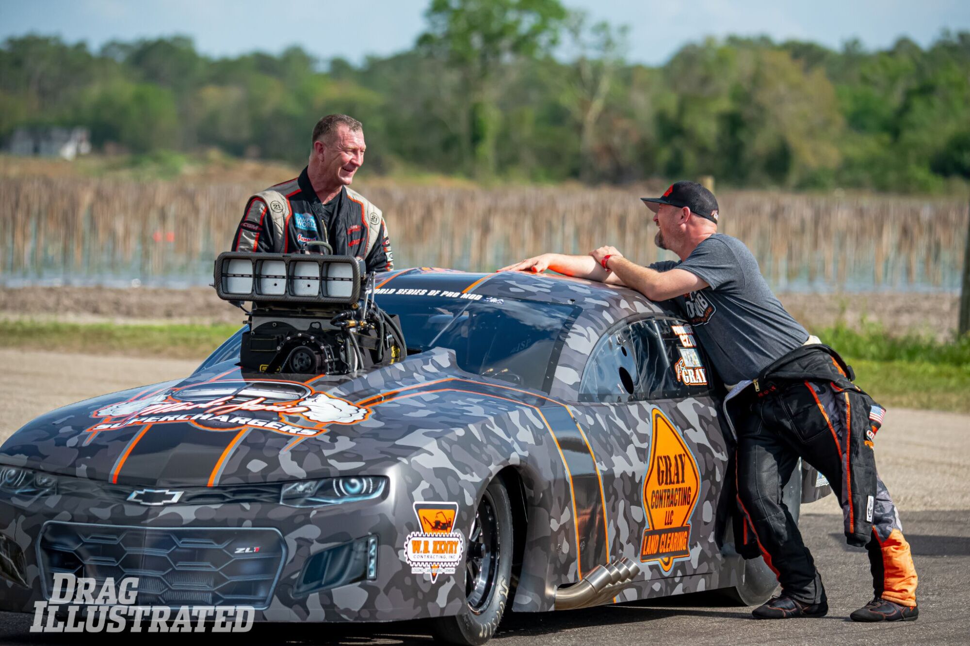 GREEN AND GRAY: Chad Green (left), who just one month prior won the Top Fuel vs. Funny Car Shootout during the PRO Superstar Shootout in his nitro Funny Car, shares a laugh with fellow Pro Mod competitor J.R. Gray at the top-end turnoff.