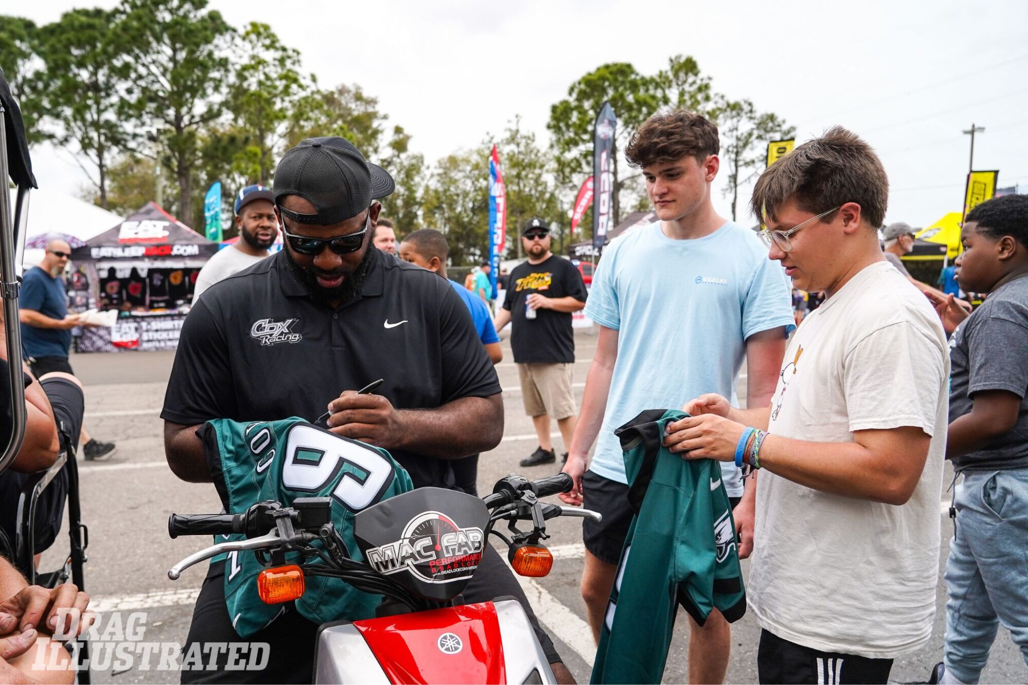 ALWAYS AN EAGLE: Cox Racing team owner Fletcher Cox signs jerseys for young fans on his way back to the pits after a pass by his “Nova Joe” Albrecht-driven, ProCharged ‘69 Camaro. Cox recently announced his retirement from the Philadelphia Eagles, where he played for 12 seasons.