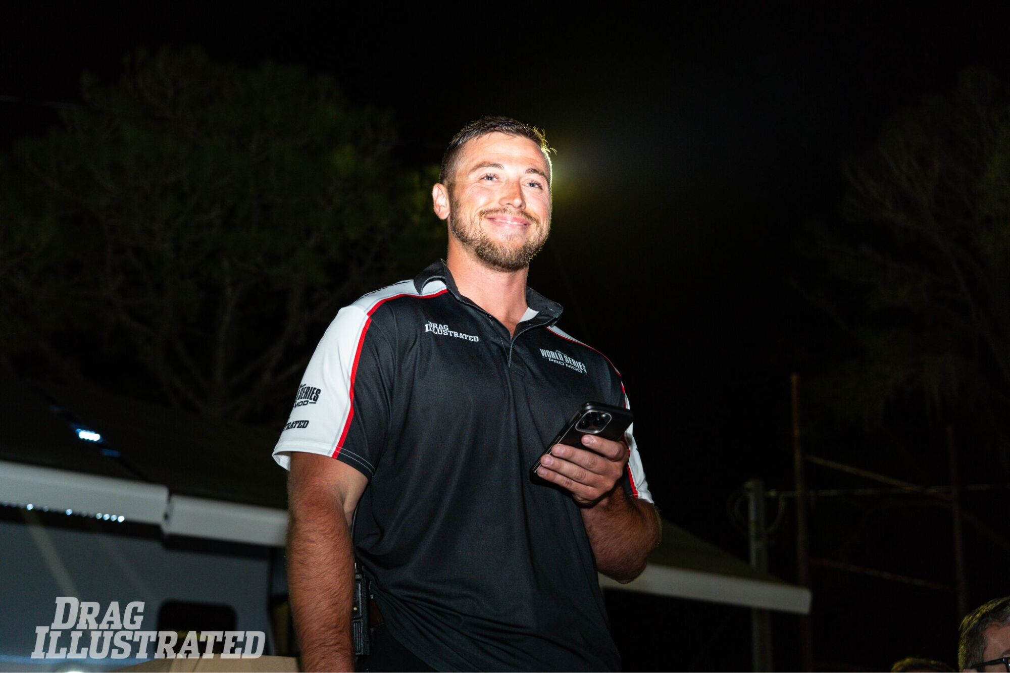 IN THE CLUB: Stroud Safety’s Tommy Cunningham sports the RACERSCLUB “Late Night” t-shirt as he unwinds after making a pass in his screw-blown ‘67 Mustang in the Chicago-Style Second-Chance Race at WSOPM.