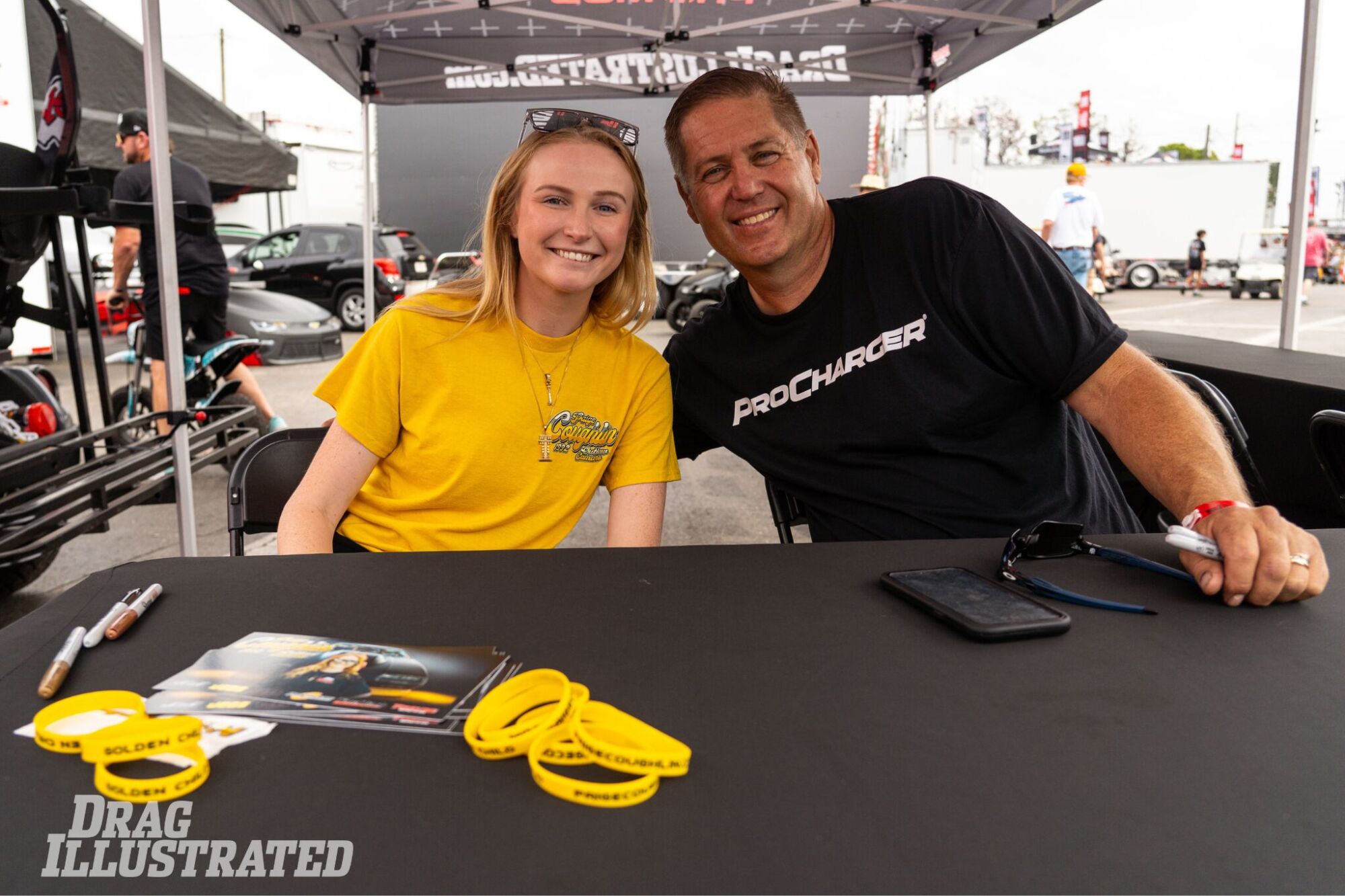 SMALL WORLD: Paige Coughlin and Mike Bowman, who typically race against each other in Street Outlaws: No Prep Kings competition, pose for a quick photo between signings at an autograph session at the DI booth at WSOPM. Coughlin competed in Top Dragster, while Bowman was attempting to become the first-ever two-time WSOPM champion.