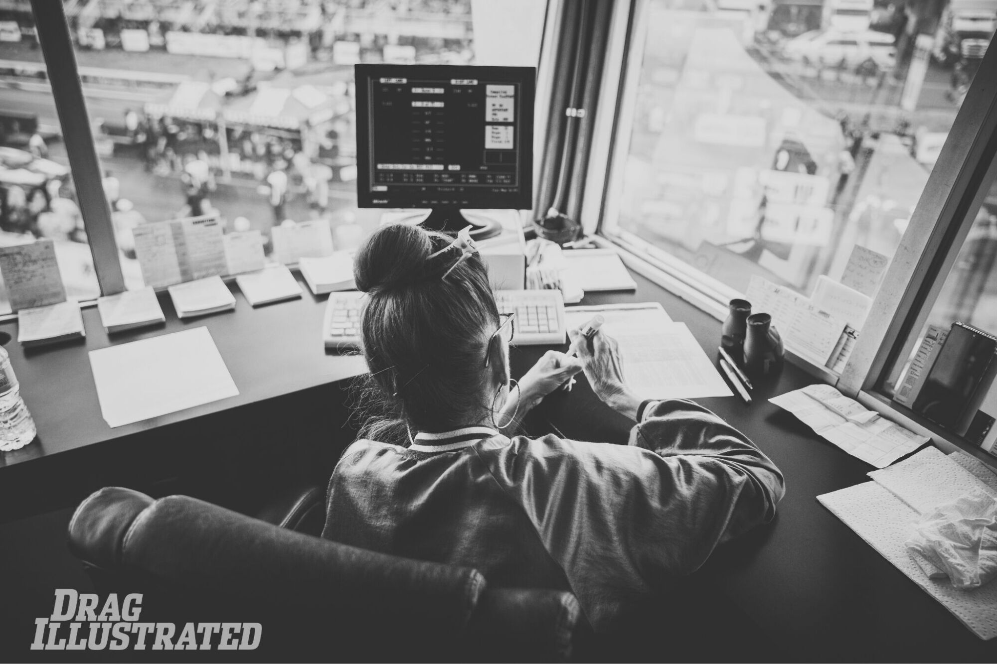 THE LAW: Bradenton Motorsports Park General Manager and Tower Coordinator Laurie “Law” Johnson watches over the starting line from her post in race control, where she runs the computer and contributes to the overall flow of the event.