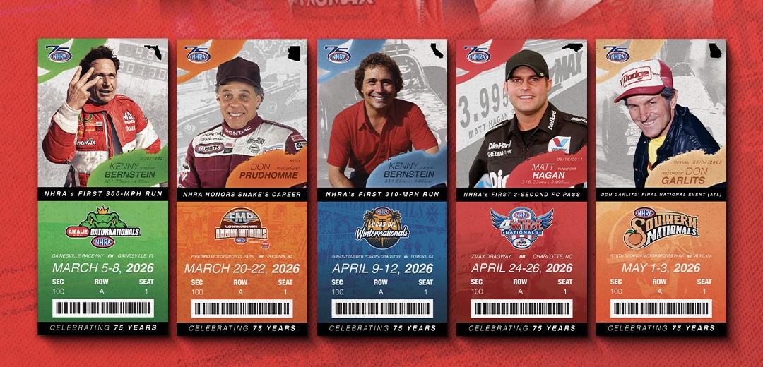 NHRA announced today the commemorative tickets for the first five races have been released, honoring legends Kenny Bernstein (Gainesville and Pomona), Don Prudhomme (Phoenix), current Funny Car star Matt Hagan (Charlotte) and Don Garlits (Valdosta, Ga). The collector’s item offers another opportunity to celebrate 75 years of NHRA Drag Racing and the special moments – and incredible drivers – that have filled the past seven-plus decades.