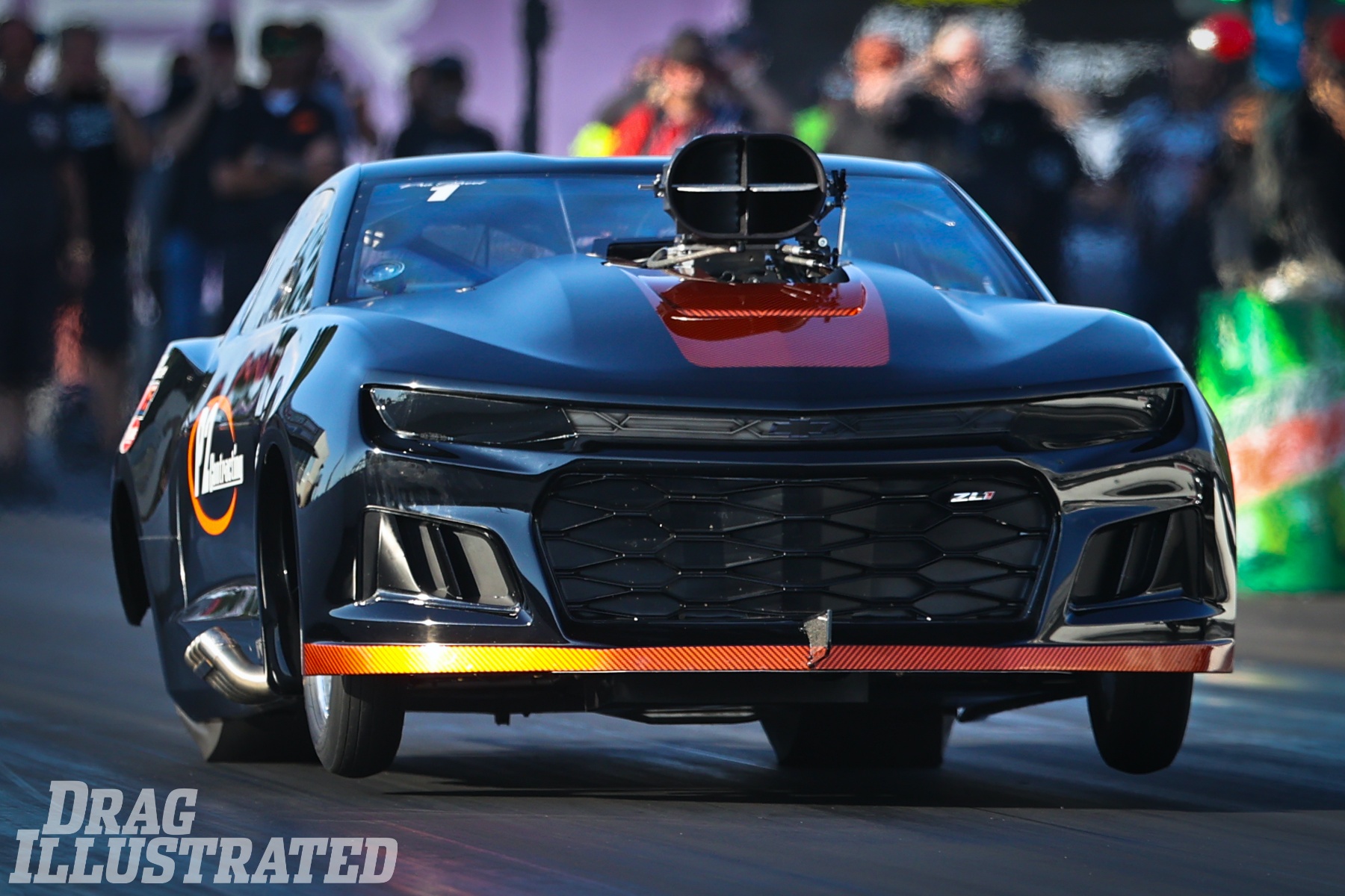 Green in his screw-blown “Gamechanger” ’00 Firebird opened Pro Street’s first round of eliminations with a holeshot win over 2023 world champion Bill Riddle, who followed Green’s 3.96 at 193.38 with a 3.95 at 190.48. The Chesterfield, Virginia-based driver then set low E.T. of the next two rounds, beating No. 1 qualifier Fletcher Cox’s 3.966 with a 3.912 at 199.85 in the second round and a 3.901 at 200.41 to take out young gun Scott Kincaid and his 3.942 in the semis.