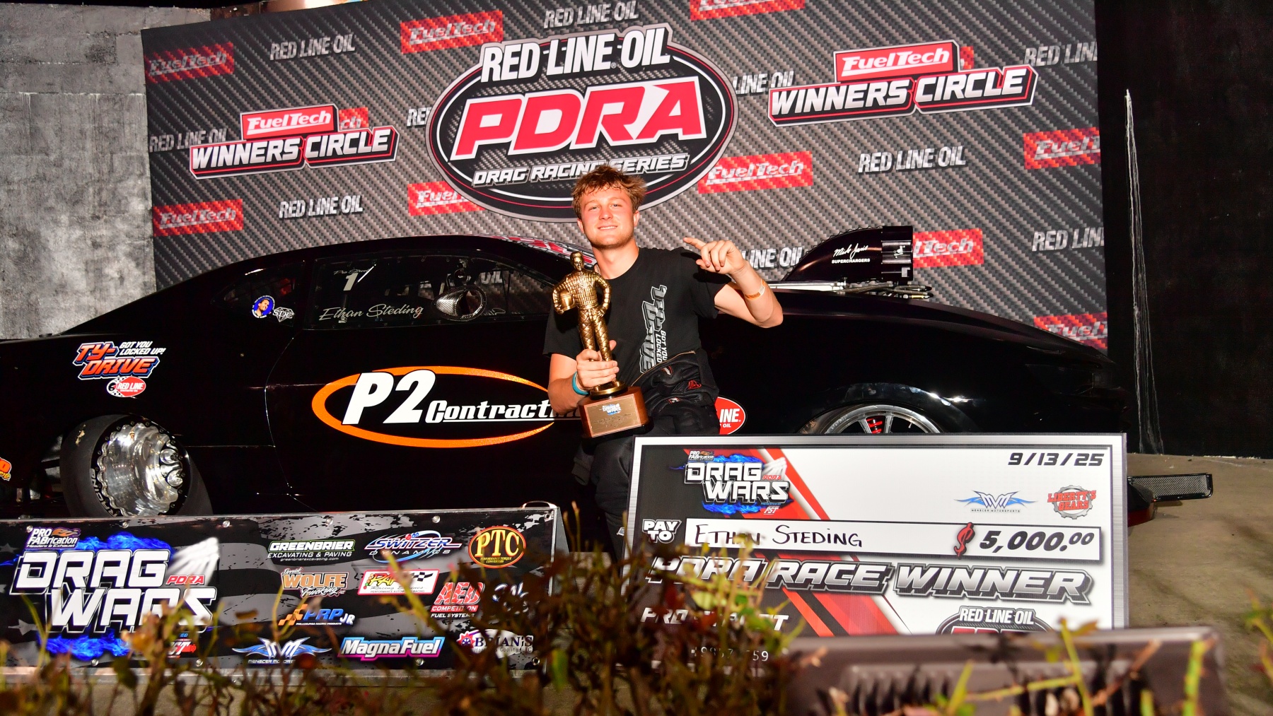 Reigning Pro Street world champion Ethan Steding trailed Blake Denton in the points standings for the first half of the season, but when he took out Denton in the opening round at the Thunder Valley Throwdown at Bristol Dragway, the door was open for Steding. He ran right through it, charging to a runner-up finish in the Thursday night completion of the rain-delayed Bristol race, then followed it up with his third win of the season on Saturday night at the Red Line Oil PDRA Drag Racing Series’ ProFab DragWars presented by PST Driveshafts at GALOT Motorsports Park.