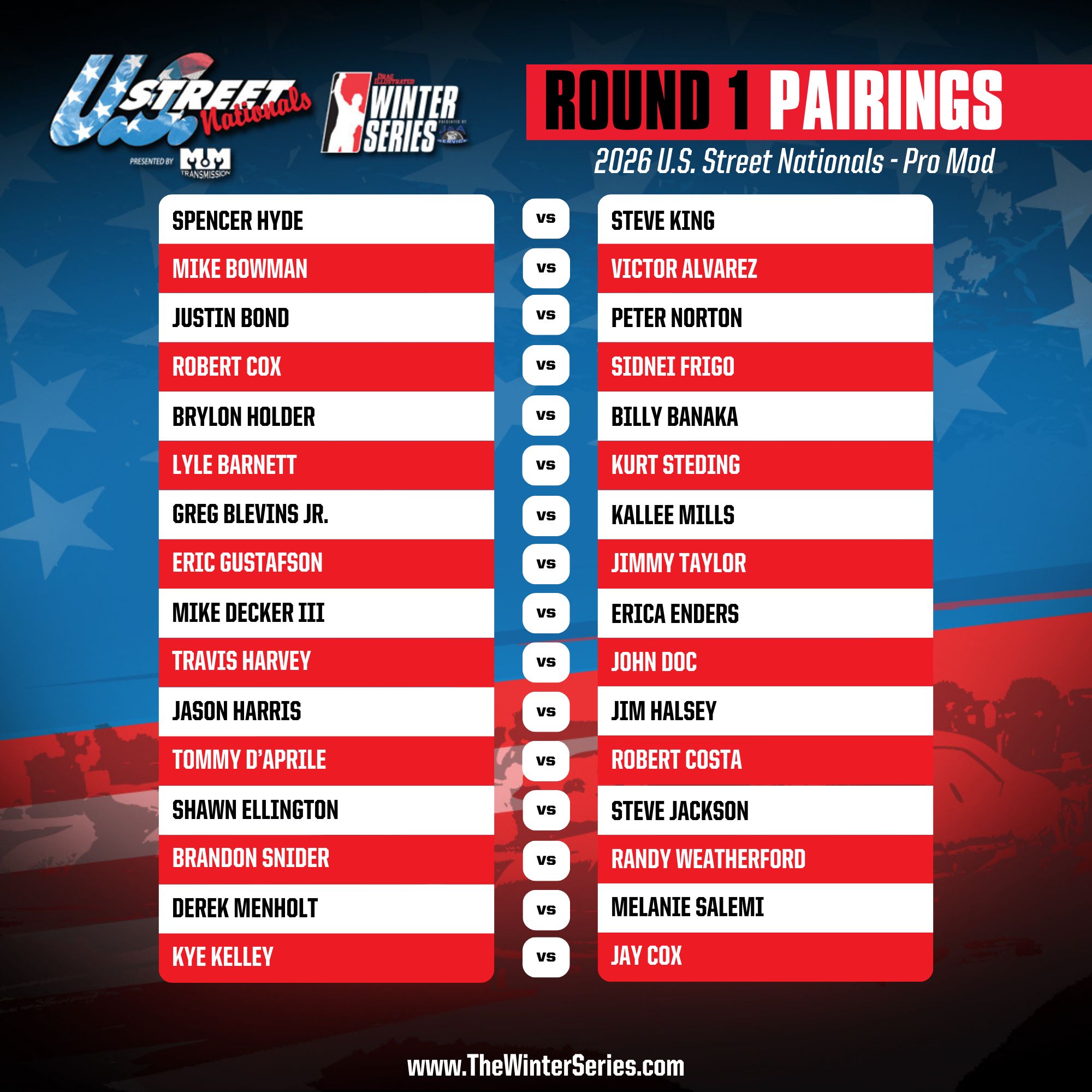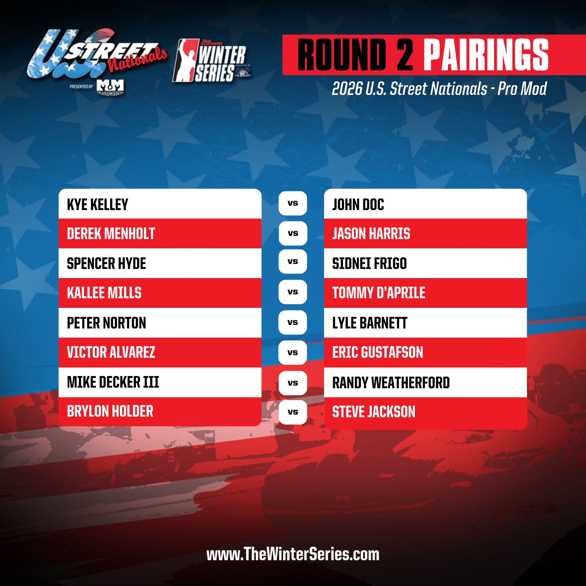 The U.S. Street Nationals presented by M&M Transmission continues at Bradenton Motorsports Park including Pro Mod final qualifying, opening rounds of eliminations in the FuelTech Radial Outlaws Racing Series drag radial classes, and the first round of eliminations in Pro Mod, Pro 10.5, True 10.5, and Lil Gangstas.