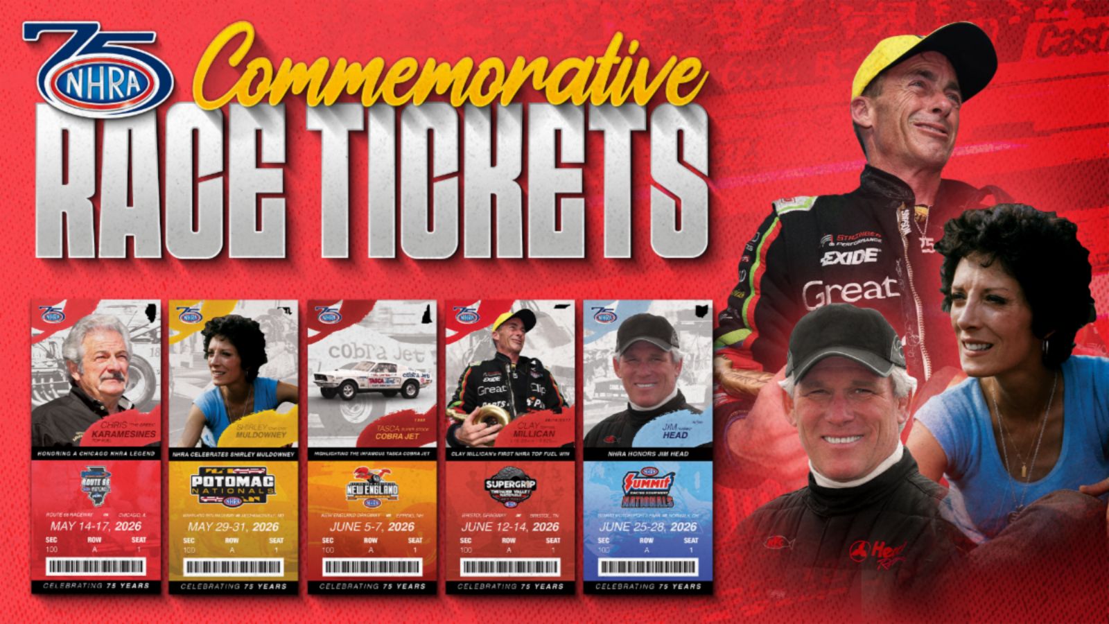 The unique commemorative tickets will continue to honor NHRA legends past and present at the sixth through 10th race of the celebratory season, including Chris “The Greek” Karamesines (Chicago), Shirley Muldowney (Maryland), the Tasca Super Stock Cobra Jet (Epping), current star Clay Millican (Bristol) and Jim Head (Norwalk).