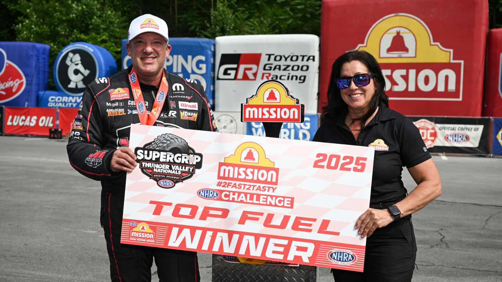 J.R. Todd (Funny Car), Aaron Stanfield (Pro Stock) and Gaige Herrera (Pro Stock Motorcycle) also won the Mission #2Fast2Tasty Challenge, while Austin Prock (Funny Car), Dallas Glenn (Pro Stock) and Brayden Davis (Pro Stock Motorcycle) qualified No. 1 at the eighth of 20 races during the 2025 NHRA Mission Foods Drag Racing Series season.