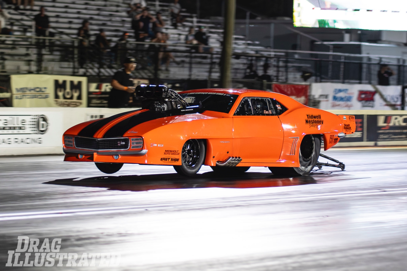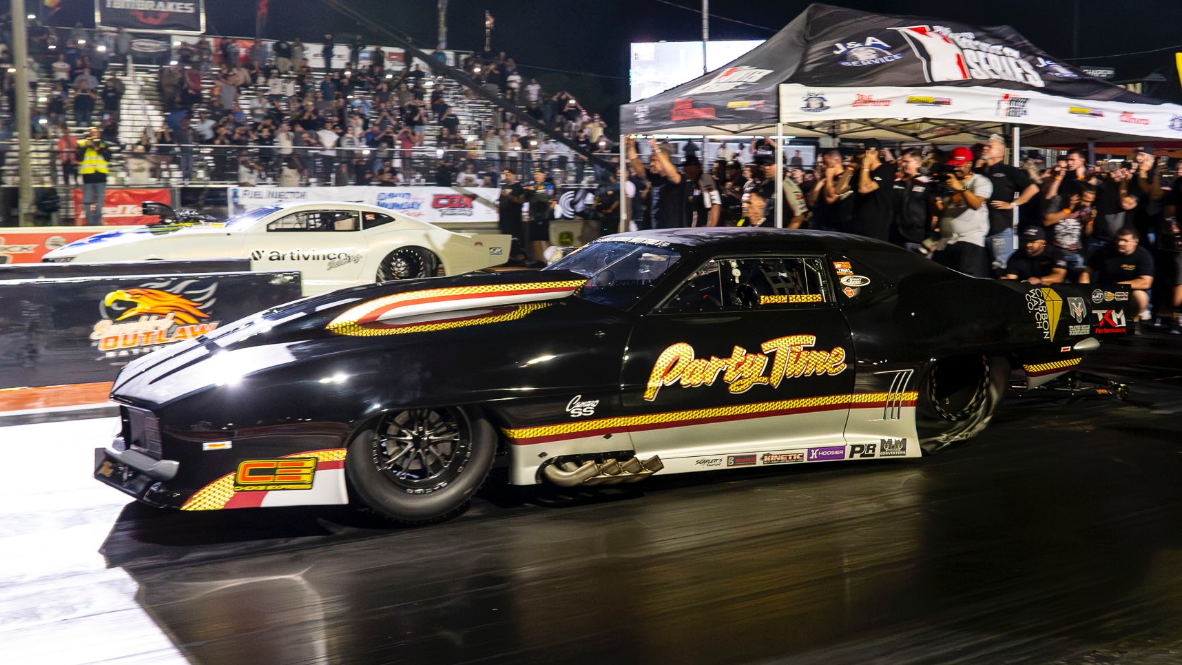 With a special “Party Time” Harold Denton tribute wrap on his Harts Charger-boosted ’69 Camaro, Harris qualified No. 1 and went to the final round to line up against Brazil’s Sidnei Frigo. Harris left the line first and won with a 3.561-second ET at 211.06 mph to Frigo’s 3.570 at 211.33.