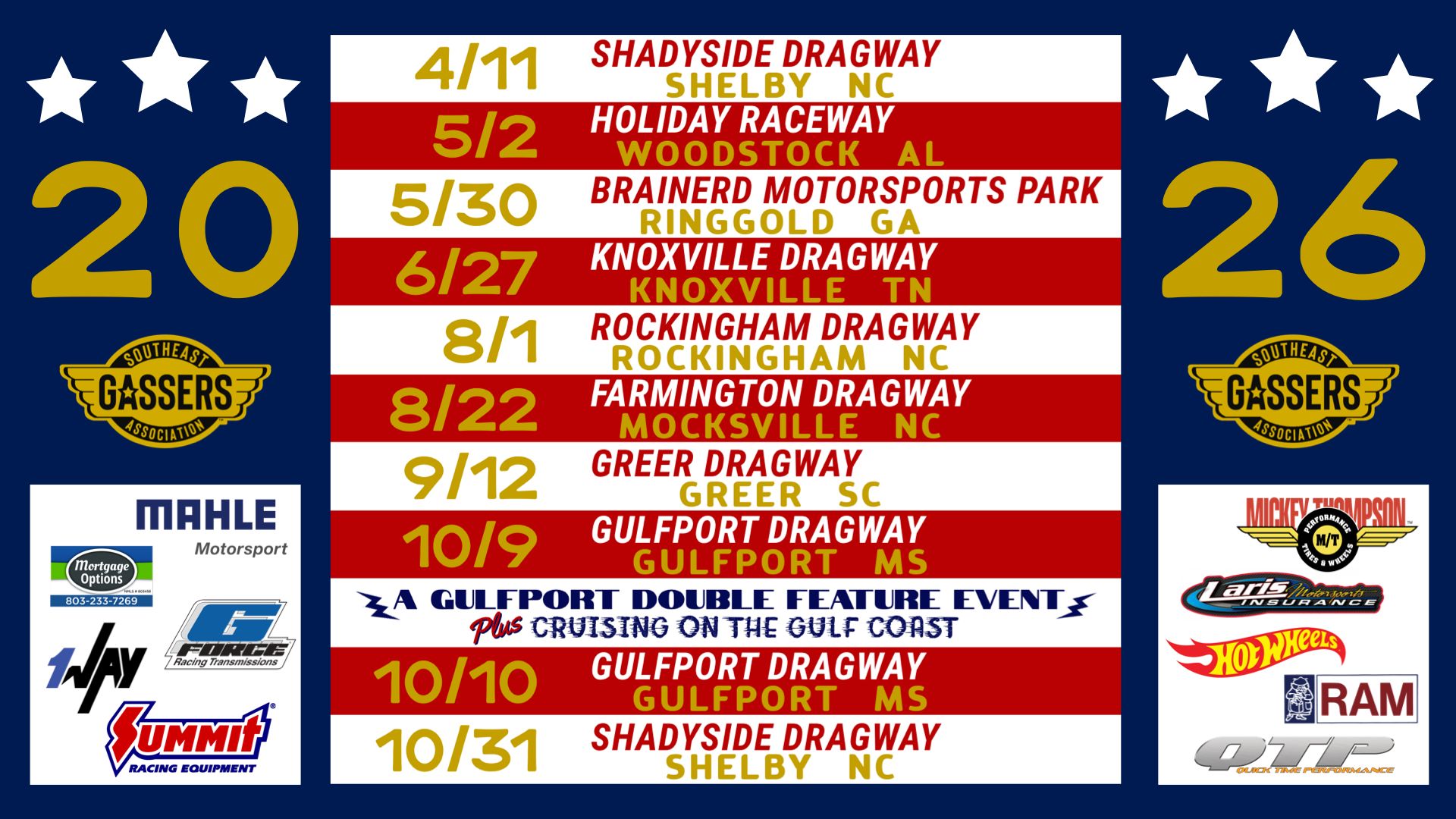 Premier nostalgia gasser drag racing returns in 2026 with the Southeast Gassers Association contesting a championship season that will span the heart of the Southeast. The 2026 schedule starts in the month of April and will run through, after a summer break in July, the month of October. From North Carolina to Mississippi, a total of six Southeastern states will be visited including South Carolina, Georgia, Tennessee, and Alabama. Eight race tracks will host SEGA drag racing with a total of 10 championship events for competitor and fan alike to partake.