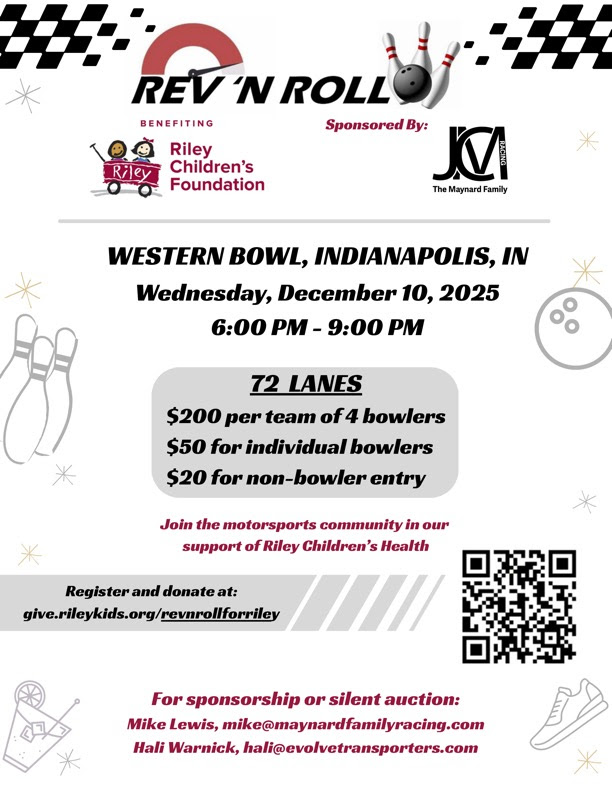 The event offers race fans the opportunity to bowl and mingle alongside their favorite drivers while supporting an important community cause. With backing from the Brownsburg-based JCM Racing team, Indianapolis residents and longtime Riley supporters Mike Lewis and Hali Warnick are spearheading the event’s return. Lewis and Warnick aim to raise funds for the nationally ranked children’s hospital foundation through lane sales as well as a silent auction, which will go live on Dec. 1.