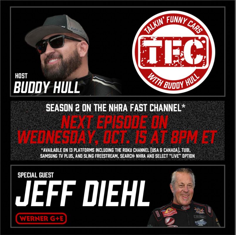 Fans of Diehl can watch the episode on the NHRA FAST Channel, available free on 13 platforms including The Roku Channel (USA & Canada), Tubi, Samsung TV Plus, Sling Freestream and others. After the show airs tonight, it will be uploaded to the Talkin’ Funny Cars with Buddy Hull YouTube channel.