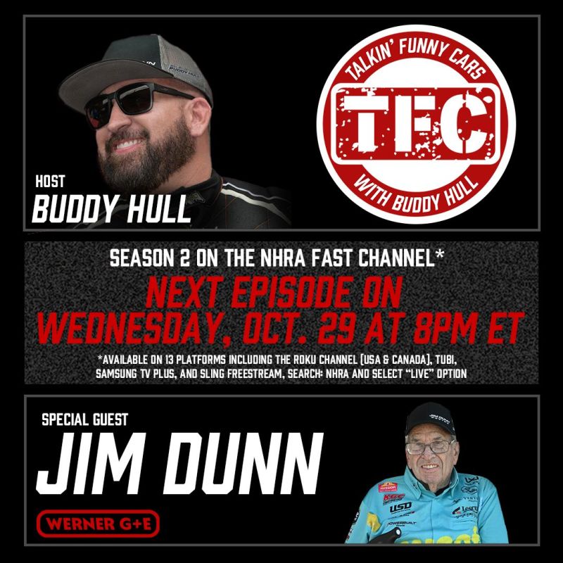 In one of the most special episodes of ‘Talkin’ Funny Cars with Buddy Hull’ to date, host Buddy Hull continues season 2 by sitting down with his team owner, “Big Jim” Dunn, one of the true legends of NHRA drag racing. The episode premieres this Wednesday, October 29, at 8 p.m. ET and 8 p.m. PT on the NHRA FAST Channel.