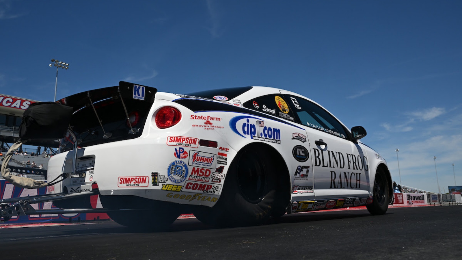 Chomiski races with the support of Blind Frog Ranch Outpost and Tours; California Import Parts Ltd. – CIP1.com; Scott Seed; NC Machine and Tool Co.; Watson Concrete; Associated Concrete Inc. (ACI); Maxima Performance Auto; Lone Star Gasket and Supply; Do Good International; and Chomiski Performance.