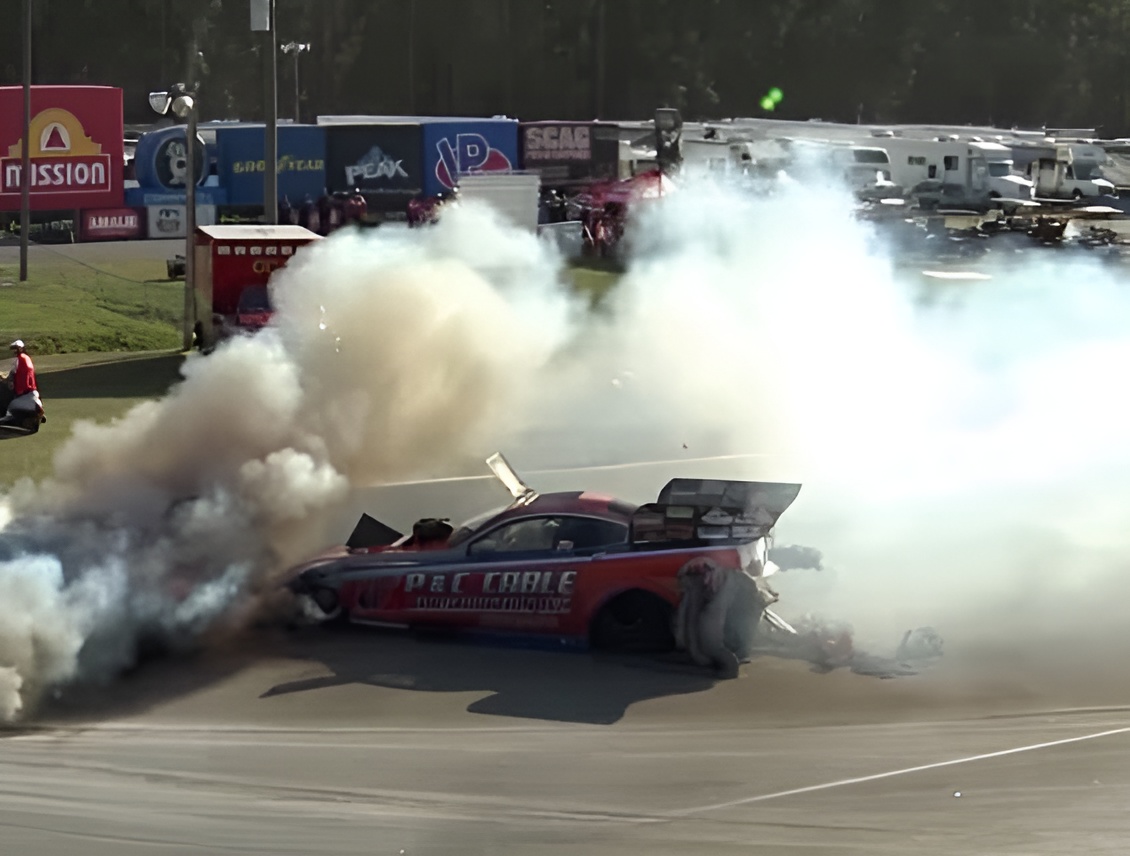 Haddock had just completed a strong 4.12-second pass and had lifted early at approximately 800 feet. Near the top end of the track, the Buddy Hull’s car caught fire and crossed into Haddock’s lane, running over the left front of Haddock’s Funny Car. A parachute from Hull’s car then became entangled with the wheelie bar of Haddock’s car, pulling it sharply toward the wall. The car struck the barrier head-on and was dragged along the wall for a distance before coming to a stop. Haddock was uninjured in incident.