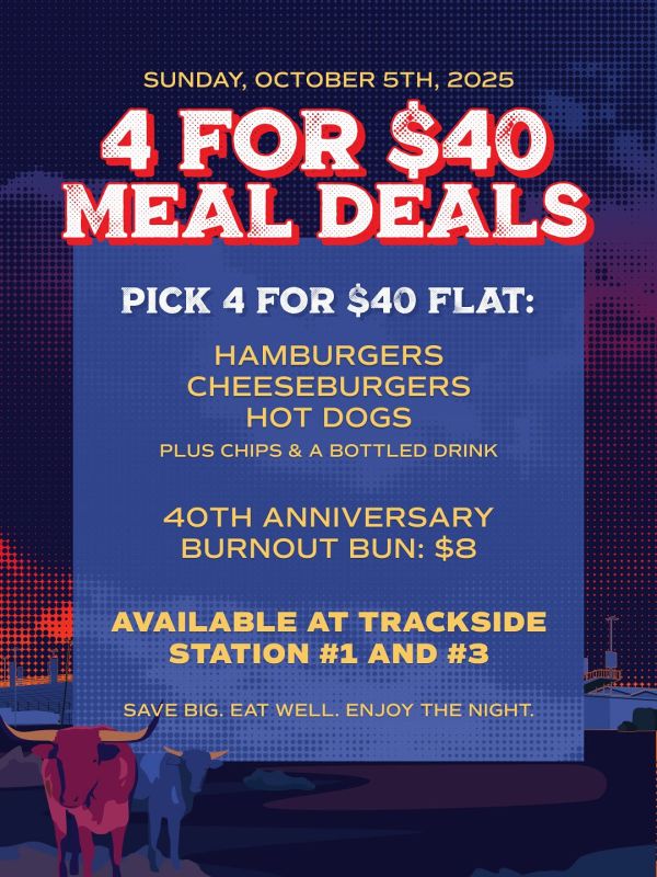 The track is offering tickets starting at just $40 with straight shooter pricing and free parking. Fans can camp for the full ten days of the Stampede of Speed for $40. Kids 12 and under are free and new for 2026 the track is offering a $40 meal deal that includes four entrées, four sides and four drinks, the perfect four-pack for a family or small group.