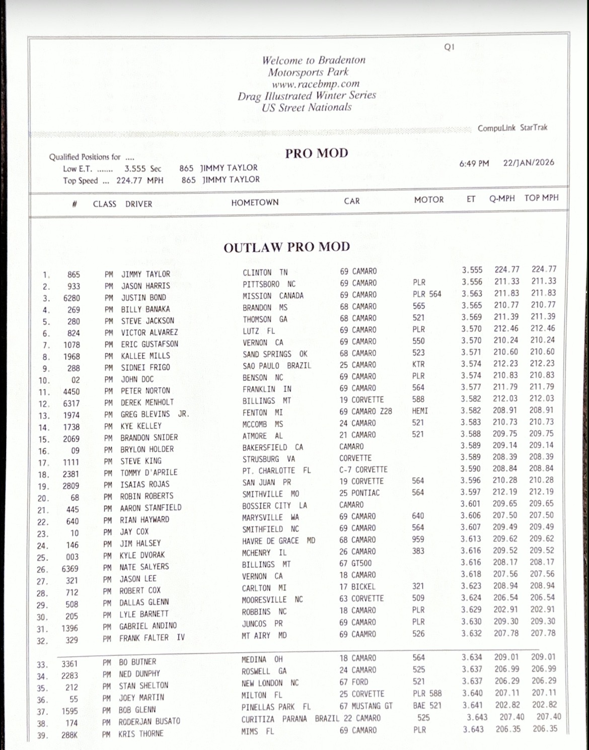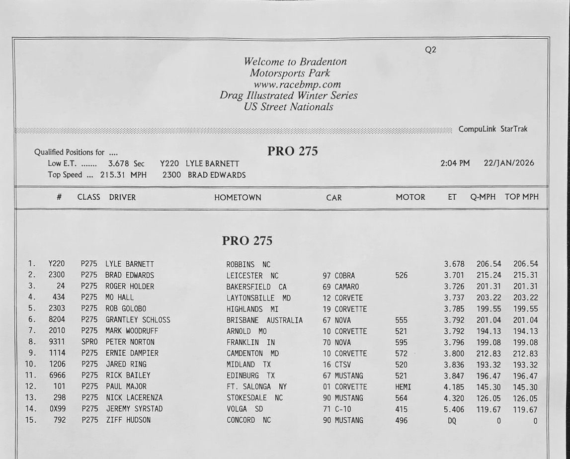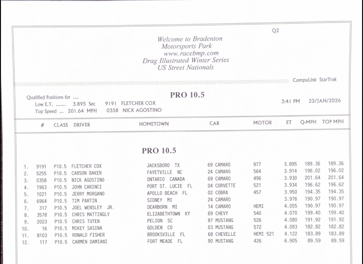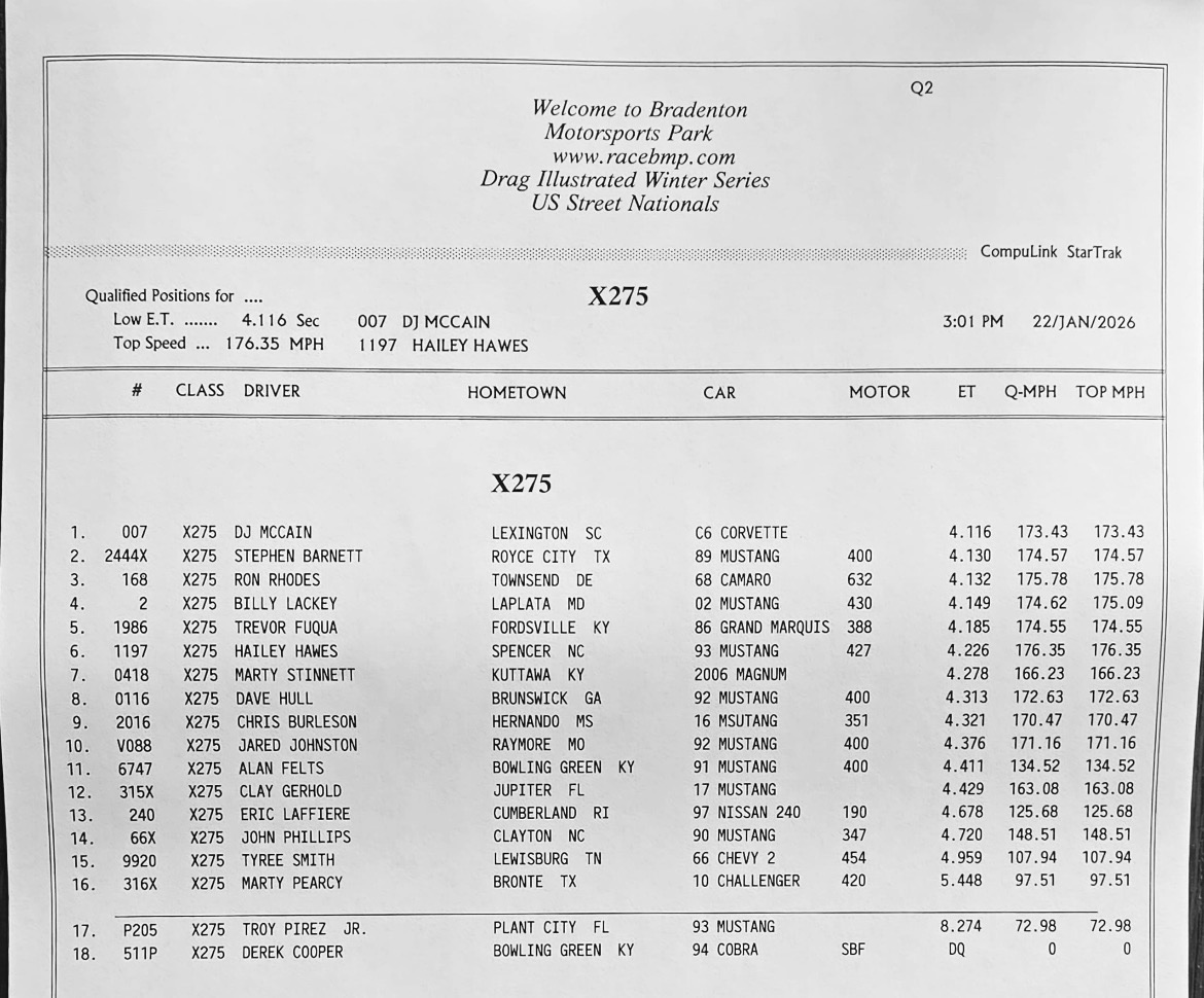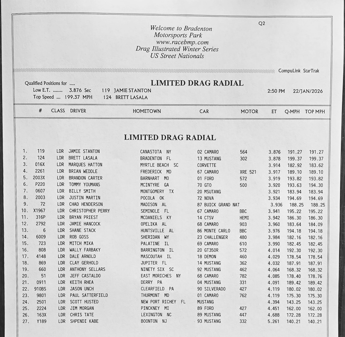 It’s day one of the 2026 U.S. Street Nationals presented by M&M Transmission, the second of three races in the 2025/2026 Drag Illustrated Winter Series presented by J&A Service, at Bradenton Motorsports Park. Thursday’s schedule includes two qualifying sessions for the FuelTech Radial Outlaws Racing Series classes and Pro 10.5, as well as one Pro Mod qualifying session and a True 10.5 shakedown session.