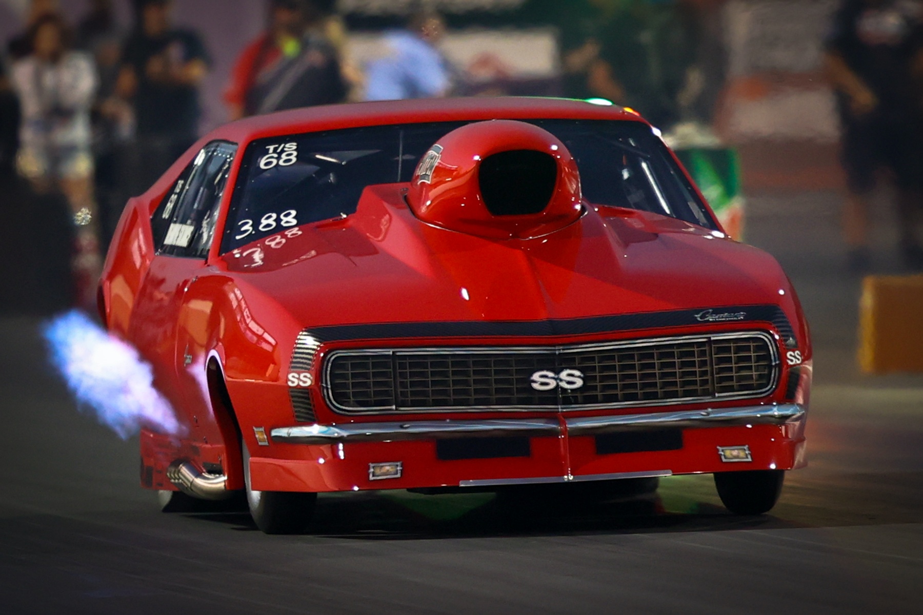 Franklin, who qualified No. 1 in his Musi-powered “Jungle Rat 3.0” ’69 Camaro, caught a lucky break in the opening round as he suffered a mechanical failure and coasted to a 4.871 at 103.37. Opponent Edward Wilson also had problems and followed to a 5.993. Franklin was back in form in the second round, where he recorded the quickest pass of the round, a 3.679 at 205.38, to beat defending world champion Fredy Scriba and his 3.709. On a semifinal bye run, Franklin took the tree and lifted to a 5.016 at 98.98.
