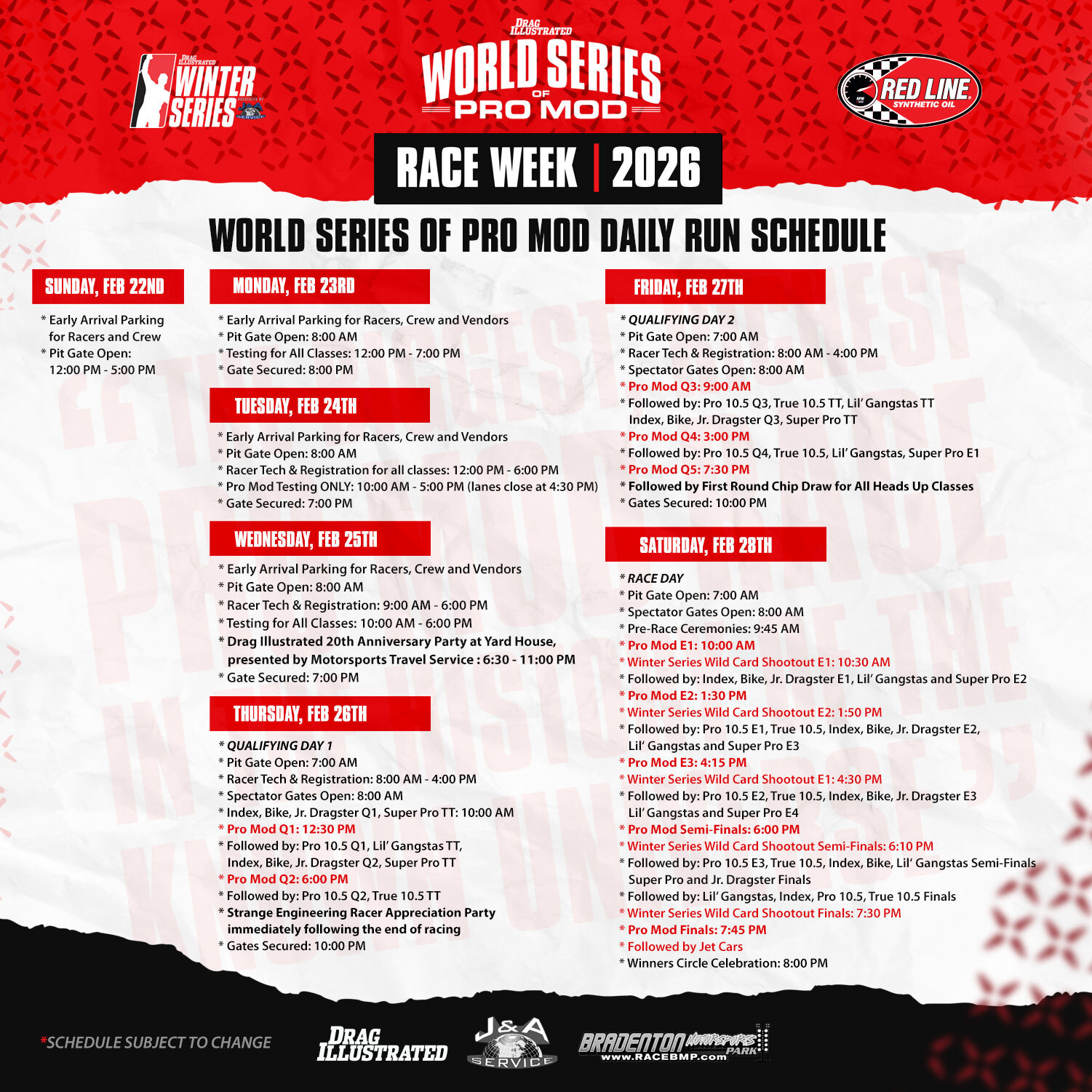 On Saturday night, the seventh winner of the Drag Illustrated World Series of Pro Mod presented by Red Line Oil will be crowned as the 2025/2026 Drag Illustrated Winter Series presented by J&A Service wraps up at Bradenton Motorsports Park. The Pro Mod winner will walk away with $150,000 and a spot on the cover of the Drag Illustrated WSOPM Issue. The WSOPM weekend will also feature side-by-side action in True 10.5, Pro 10.5, Lil Gangstas, and a handful of supporting categories.