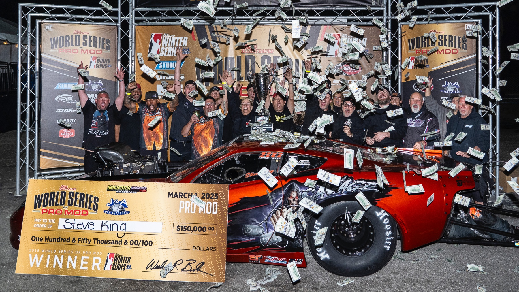 With a solid start to the PDRA season under his belt, King can reminisce once again about the WSOPM, and the absolutely surreal experience of the final round: from pulling up to the water box against Jackson with music blasting and fans’ cell phone flashlights shining throughout the stands, receiving raucous cheers from all the other teams as he headed back up the return road, to money flying and champagne and beer flowing in the winner’s circle. And while the Real American Beer that King was drinking might have had Hulk Hogan’s likeness on the can, it’s the image of King double-fisting them like “Stone Cold” Steve Austin that will be forever etched in WSOPM lore.