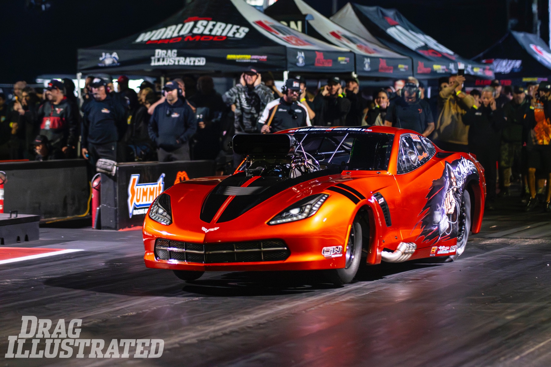 Fans walking by King’s pits are immediately met with a remarkable sight: five giant WSOPM trophies displayed proudly next to the screw-blown “Savage” ’15 C7 Corvette, a not-so-subtle reminder of King’s $150,000 victory at Bradenton Motorsports Park over “Stevie Fast” Jackson. The trophies are exact replicas of the one King took home, ordered for crew members by team owner Gene Pilot as a way to acknowledge how they all had a hand in winning “the biggest, richest Pro Mod race in the history of the known universe.”